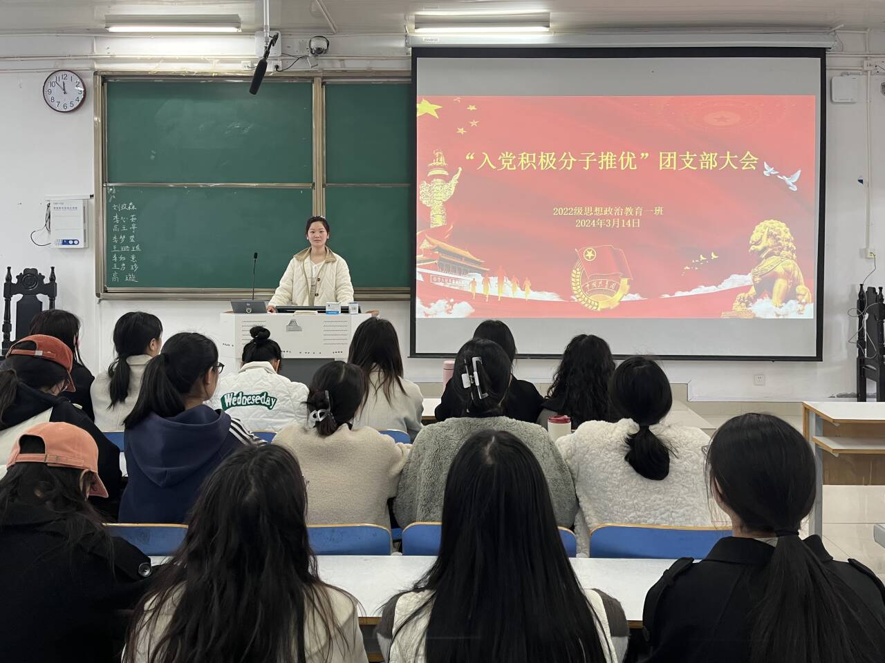 3月14日上午,ok138cn太阳集团5292022级思想政治教育一班在社科楼514教室召开“入党积极分子推优”团支部大会,我院2022级思想政治教育一班全体同学共同参与本次大会,大会由团支书李佳茹主持。