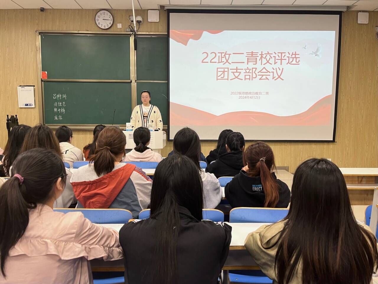 4月2日下午,ok138cn太阳集团5292022级思想政治教育二班在社科楼515教室召开青校评选团支部会议。我院2022级思想政治教育二班全体成员共同参与此次评选。会议由团支书李佳音主持。