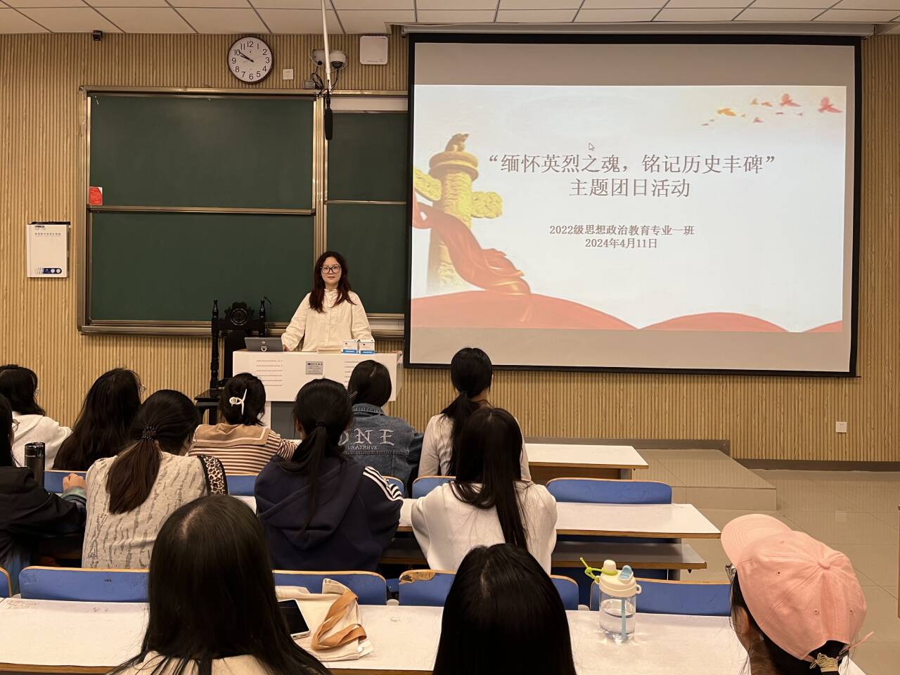 为缅怀革命英烈,弘扬爱国主义和民族精神,4月11日上午,ok138cn太阳集团5292022级思想政治教育一班在社科楼515教室开展“缅怀英烈之魂,铭记历史丰碑”主题团课,我院2022级思想政治教育一班全体同学共同参与本次团课,团课由团支书李佳茹主持。