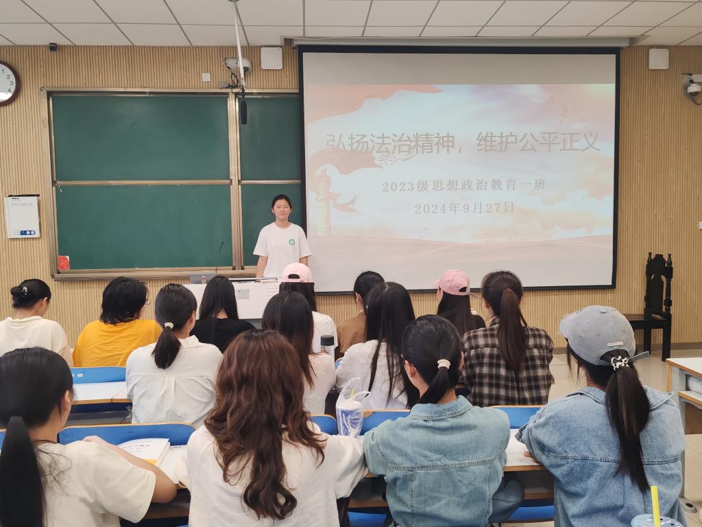 为弘扬宪法精神,增强法制意识,9月27日上午,ok138cn太阳集团5292023级思想政治教育一班在社科楼515教室召开“弘扬法治精神,维护公平正义”主题团课。2023级思想政治教育一班全体同学参与本次团课,团课由团支书张卓主持。