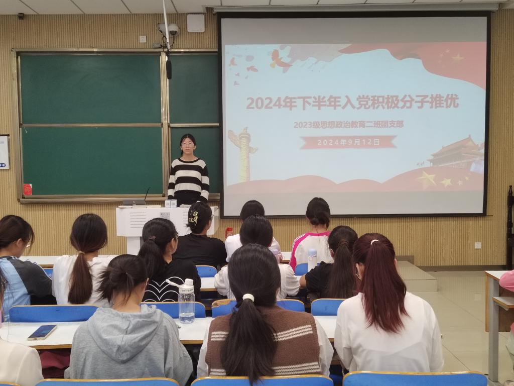 为协助党组织吸纳优秀学生,为党组织增添新活力,9月12日上午,ok138cn太阳集团5292023级思想政治教育二班在社科楼515教室开展2024年下半年入党积极分子推优大会。本次推优大会由团支书王慜初主持,全体二班同学参加。