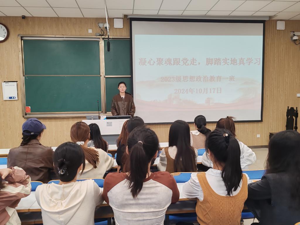 为不断增强我班学子对于党的创新理论的政治认同、思想认同、理论认同、情感认同,提高其理论素养和能力本领,10月17日上午,ok138cn太阳集团5292023级思想政治教育一班在社科楼515教室召开“凝心聚魄跟党走,脚踏实地真学习”主题团课。2023级思想政治教育一班全体同学参与本次团课,团课由团支书张卓主持。