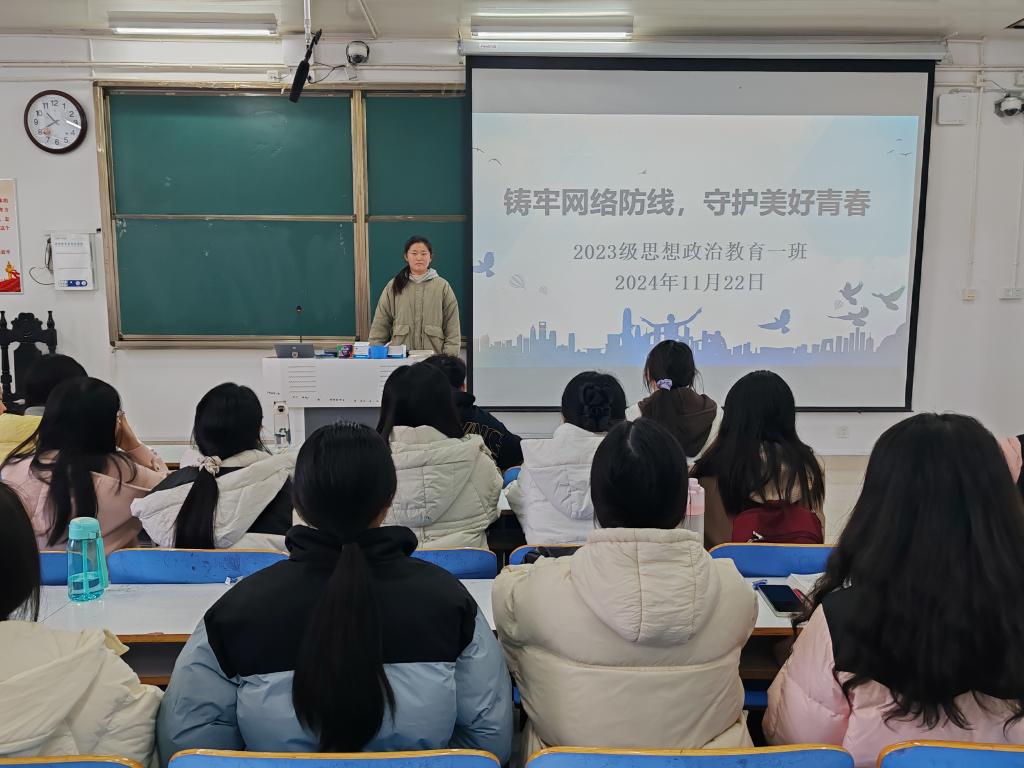 为提高我班学子的网络安全意识,11月22日上午,ok138cn太阳集团5292023级思想政治教育一班在社科楼515教室召开“筑牢网络防线,守护美好青春”主题班会。2023级思想政治教育一班全体同学参与本次班会,班会由班长张卓主持。