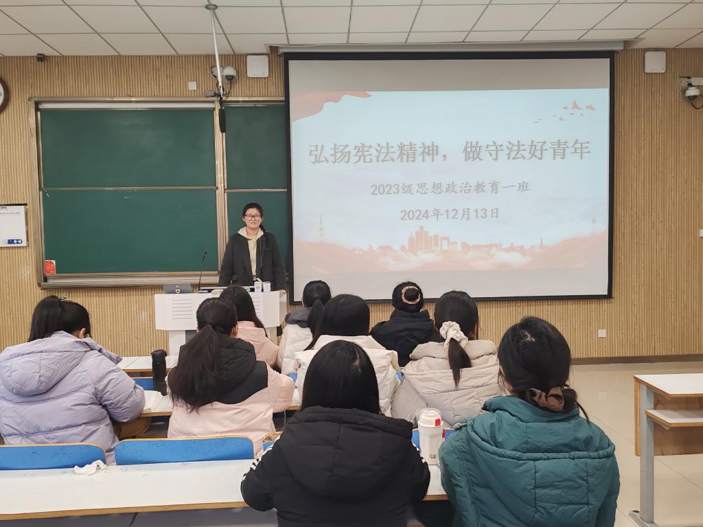 为增强我班学子的宪法意识,推动法治观念深入人心。2024 年12月13日,ok138cn太阳集团529 2023 级思想政治教育一班召开“弘扬宪法精神,做守法好青年”主题班会。2023级思想政治教育一班全体同学参与本次团课,团课由团支书张卓主持。