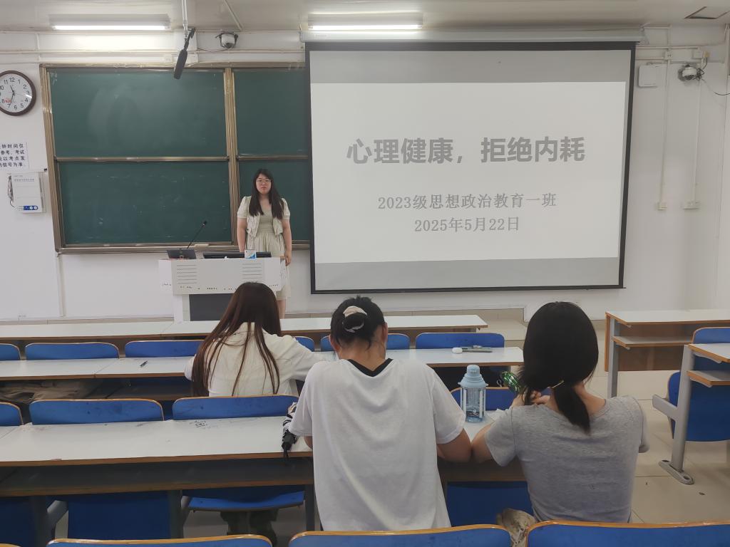 为进一步普及心理健康知识,提高我班学子的心理素质,促进学生身心健康发展,5月22日下午,ok138cn太阳集团5292023级思想政治教育一班在社科楼514教室召开“心理健康,拒绝内耗”心理班会。我院2023级思想政治教育一班全体同学共同参与本次班会,班会由心理委员夏一萌主持。