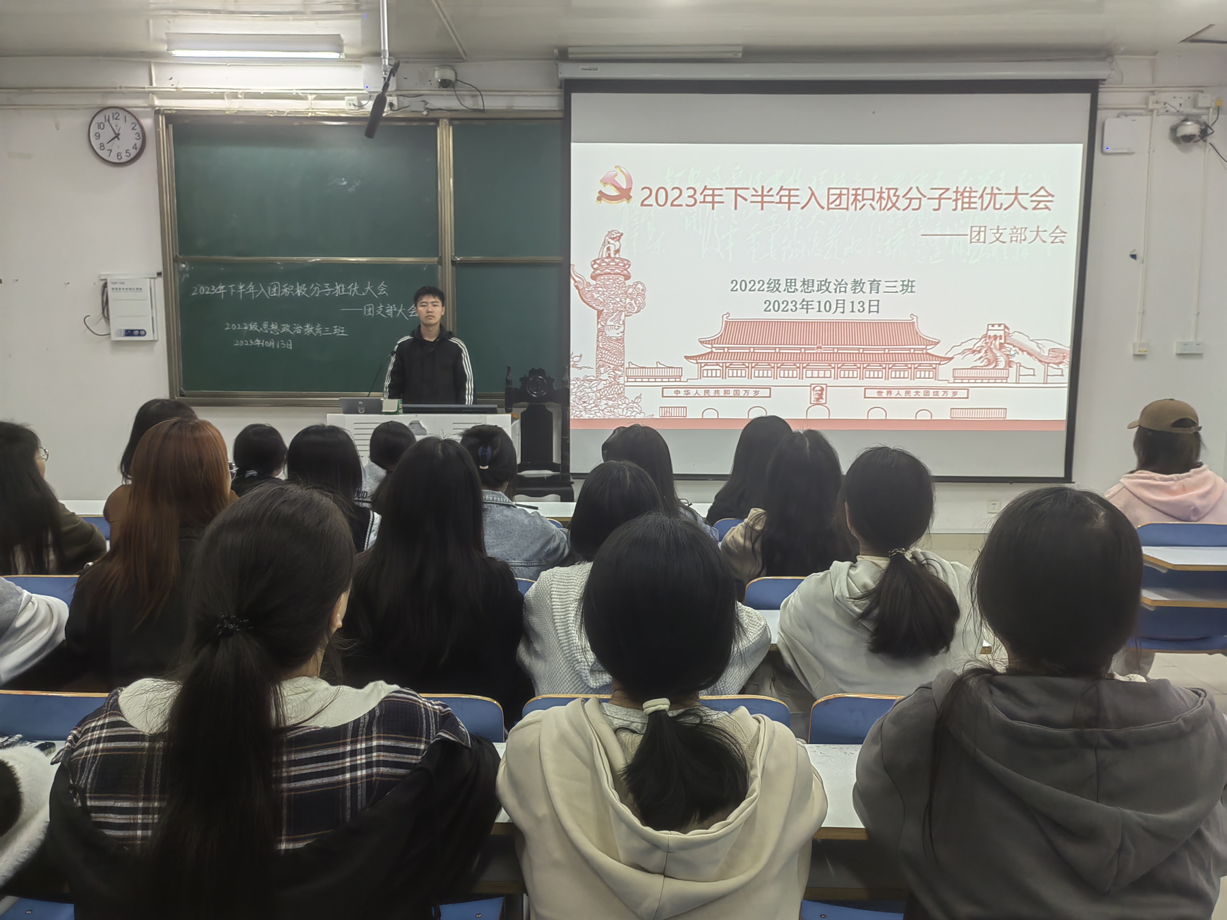 10月13日上午,ok138cn太阳集团5292022级思想政治教育三班在514教室开展入团积极分子推优大会。我院2022级思想政治教育三班全体团员共同参与此次推优大会。大会由团支书余浩洋主持。