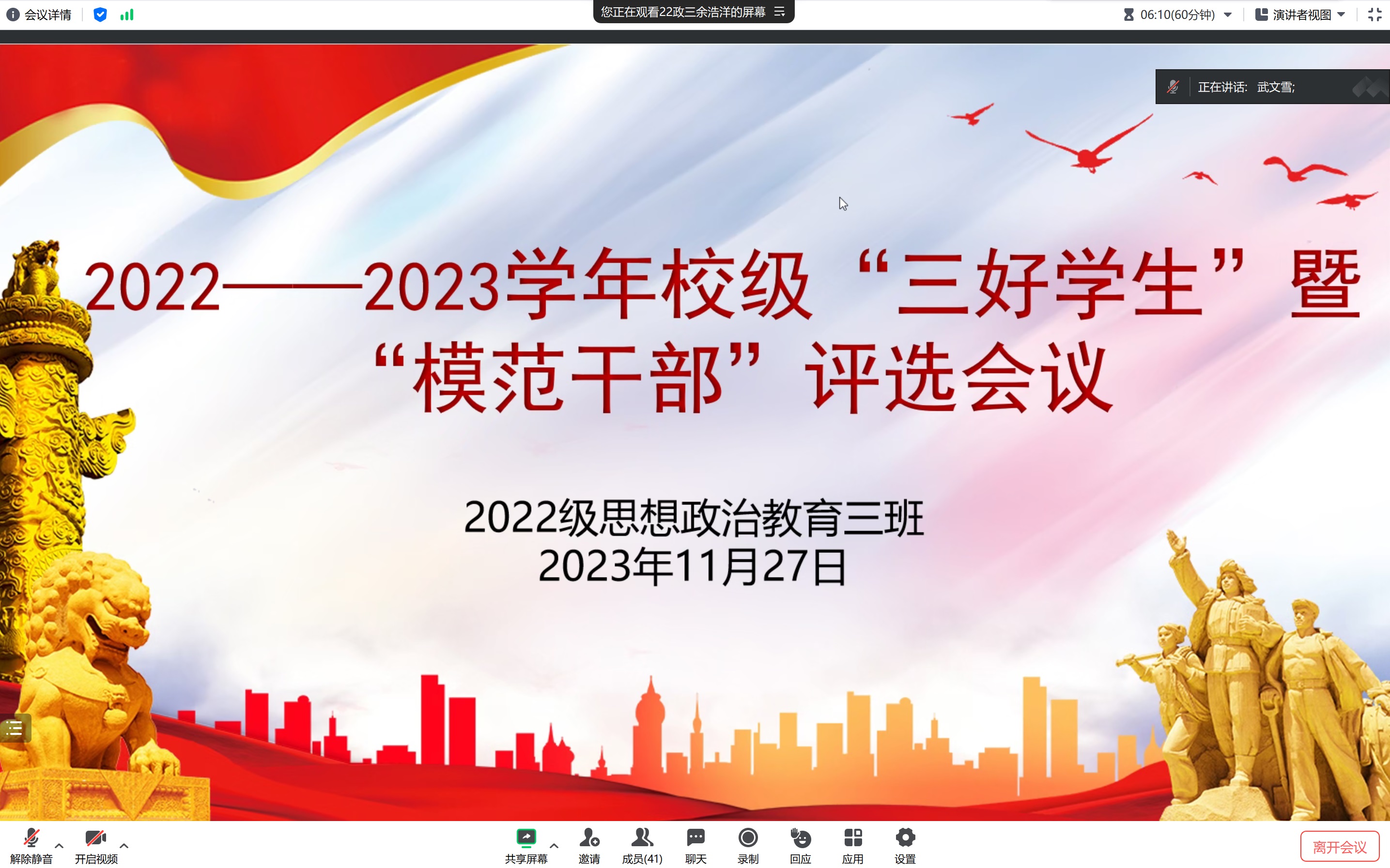 11月27日晚,ok138cn太阳集团5292022级思想政治教育三班在线上开展“三好学生”暨“模范干部”推优大会。我院2022级思想政治教育三班全体成员共同参与此次推优大会。大会由班长余浩洋主持。