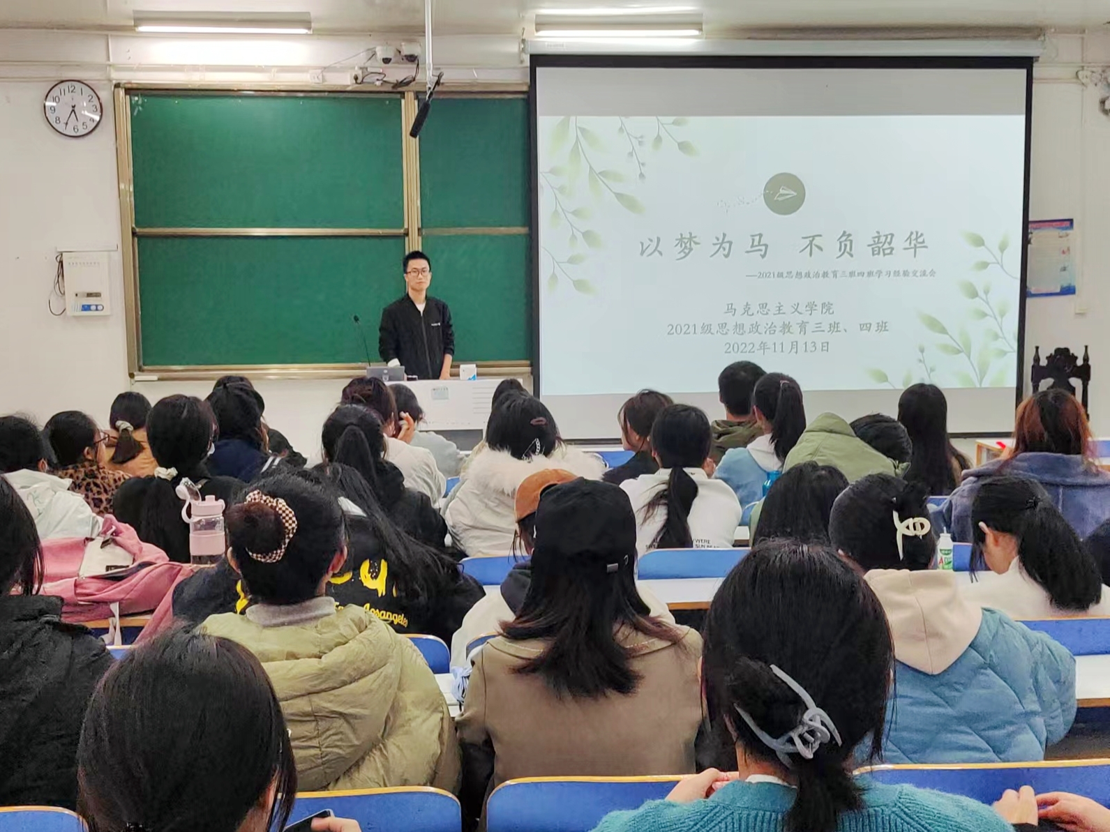11月13日下午,ok138cn太阳集团5292021级思想政治教育三班、四班在社科楼514召开“以梦为马,不负韶华”学习经验交流会。ok138cn太阳集团5292021级思想政治教育三班全体成员以及2020级思想政治教育一班申畅畅、2020级思想政治教育二班岳子怡参与此次会议。会议由学习委员于坤鹏主持。