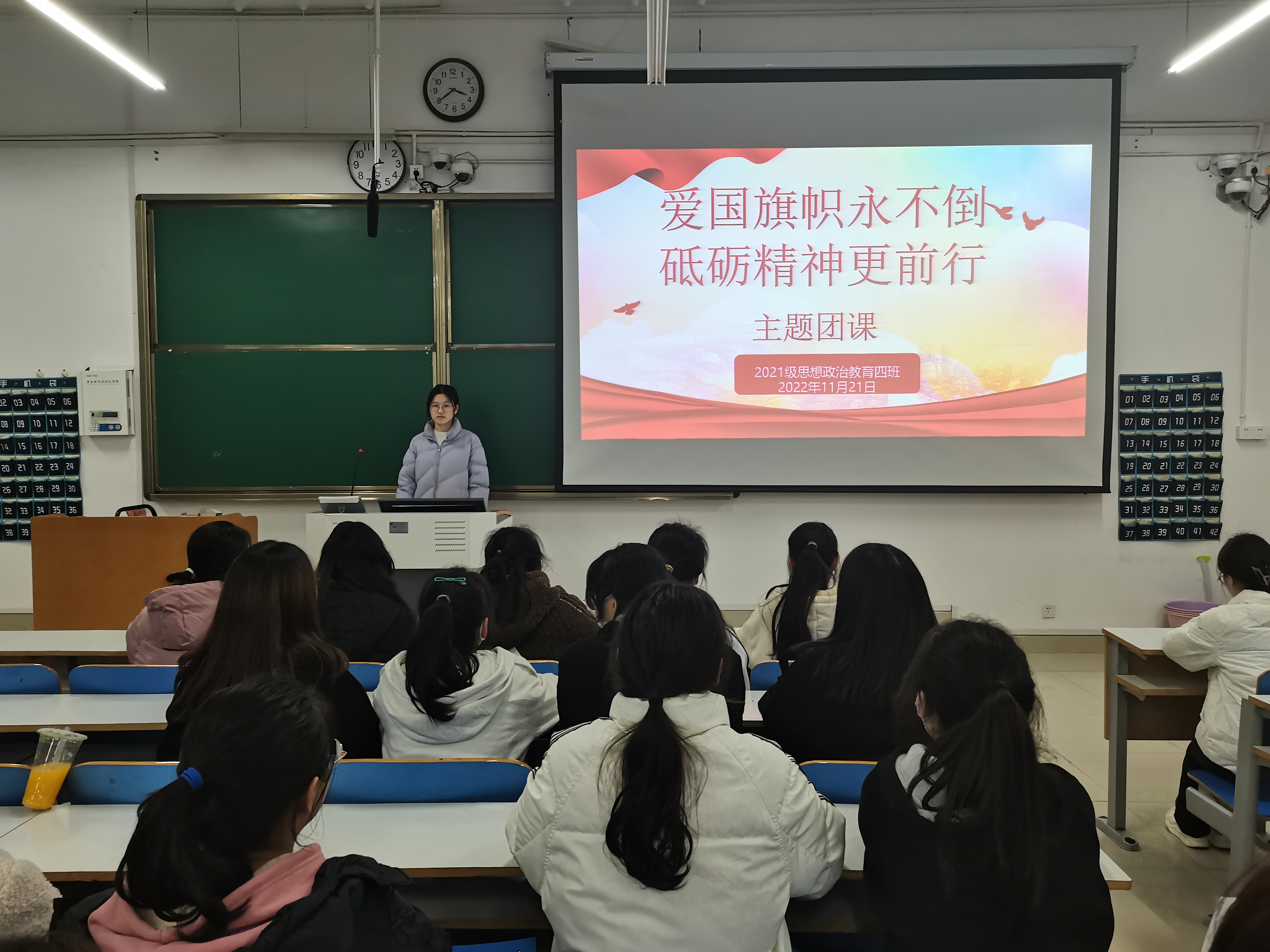 11月21日下午,ok138cn太阳集团5292021级思想政治教育四班在社科楼514教室开展“爱国旗帜永不倒,砥砺精神更前行”主题团课。2021级思想政治教育四班全体学生共同参加本次团课。团课由团支书刘珂含主持。