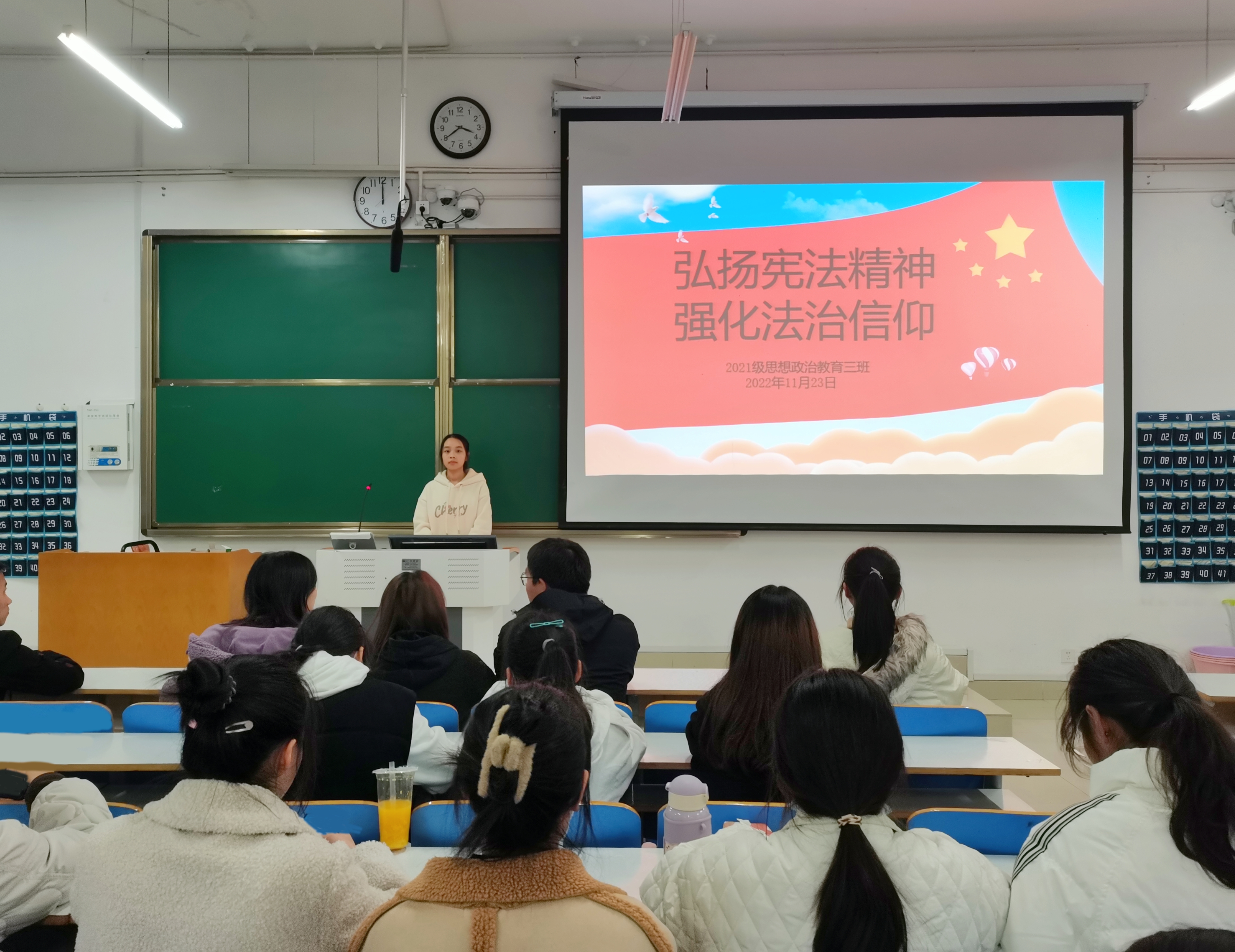 11月23日下午,ok138cn太阳集团5292021级思想政治教育三班在社科楼416召开“弘扬宪法精神,强化法治信仰”主题团课。ok138cn太阳集团5292021级思想政治教育三班全体团员参与此次会议。团课由团支书王岚霄主持。
