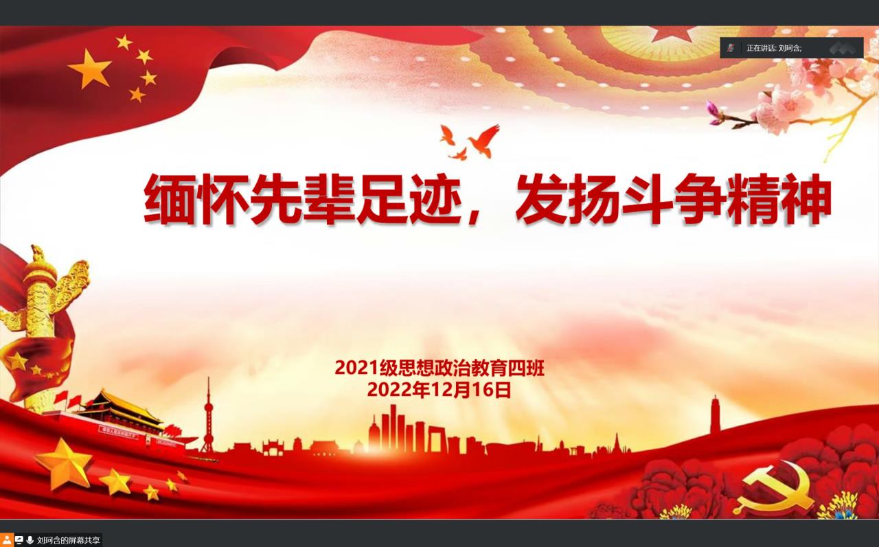 12月16日下午,ok138cn太阳集团5292021级思想政治教育四班线上召开“缅怀先辈足迹,发扬斗争精神”主题团课。思想政治教育四班全体团员参加本次团课。团课由团支书刘珂含主持。