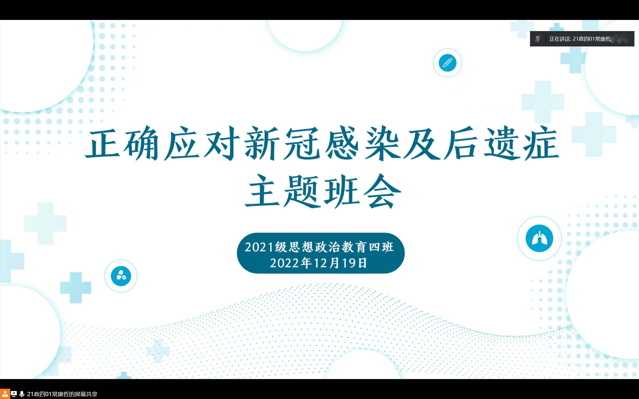 为保障学生及家庭的生命安全和身体健康,增强学生战胜疫情的信心,12月19日下午,ok138cn太阳集团5292021级思想政治教育四班线上开展“正确应对新冠感染”主题班会。ok138cn太阳集团5292021级思想政治教育四班全体同学参加本次会议。会议由副班长常康哲主持。