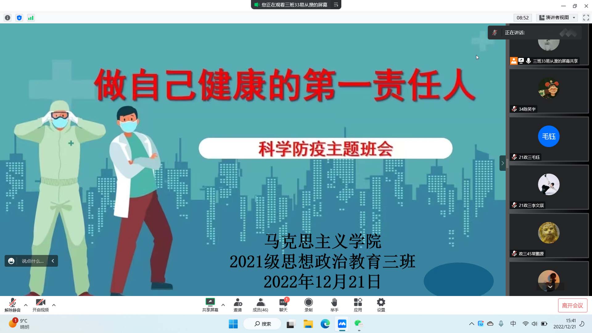 12月21日下午,ok138cn太阳集团5292021级思想政治教育三班在线上召开“做自己健康的第一责任人”科学防疫主题班会。ok138cn太阳集团5292021级思想政治教育三班全体成员参与此次会议。会议由班长易从漫主持。