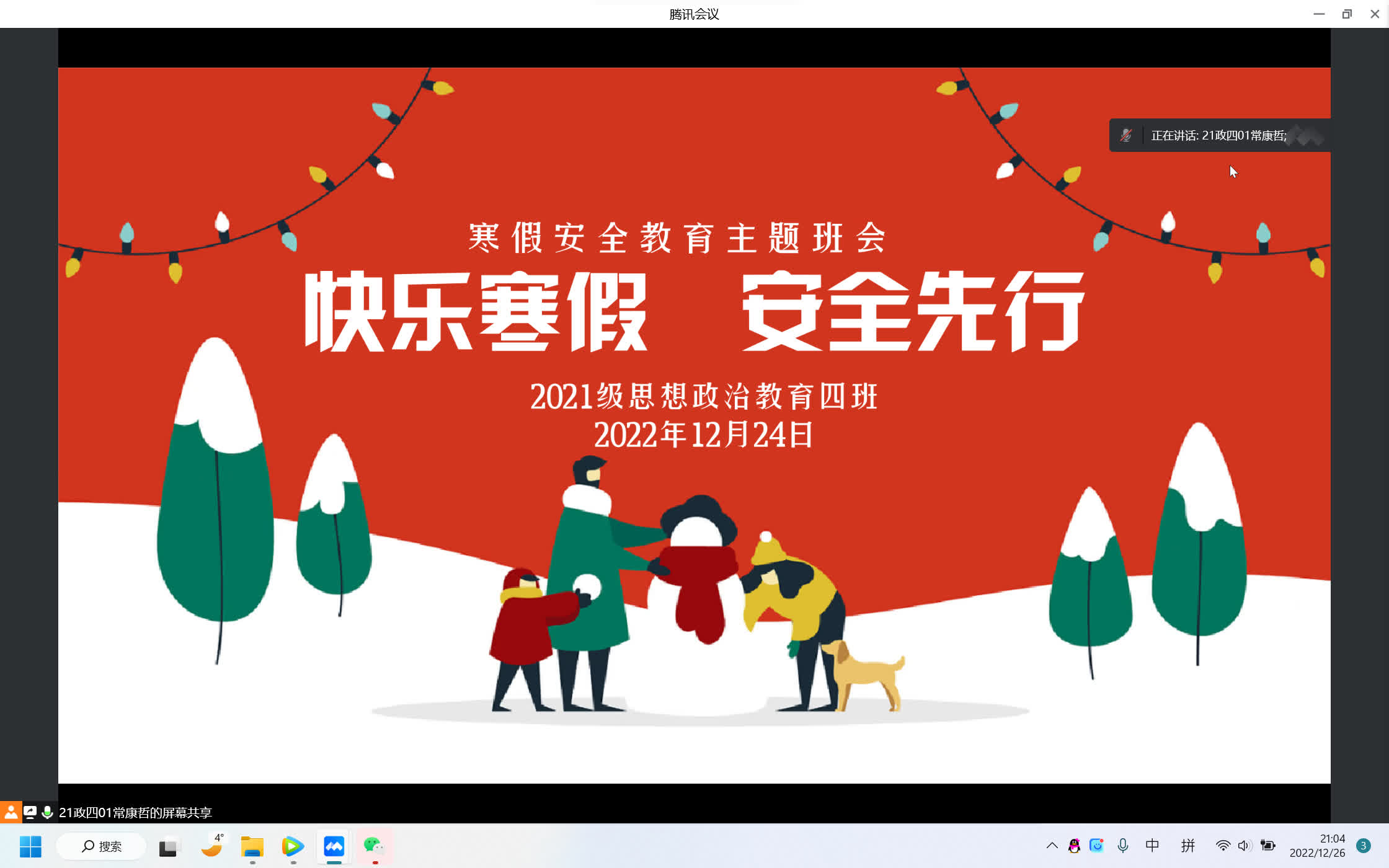 12月24日下午,ok138cn太阳集团5292021级思想政治教育四班线上开展“快乐寒假,安全先行”安全教育主题班会。ok138cn太阳集团5292021级思想政治教育四班全体同学参加本次会议。会议由副班长常康哲主持。
