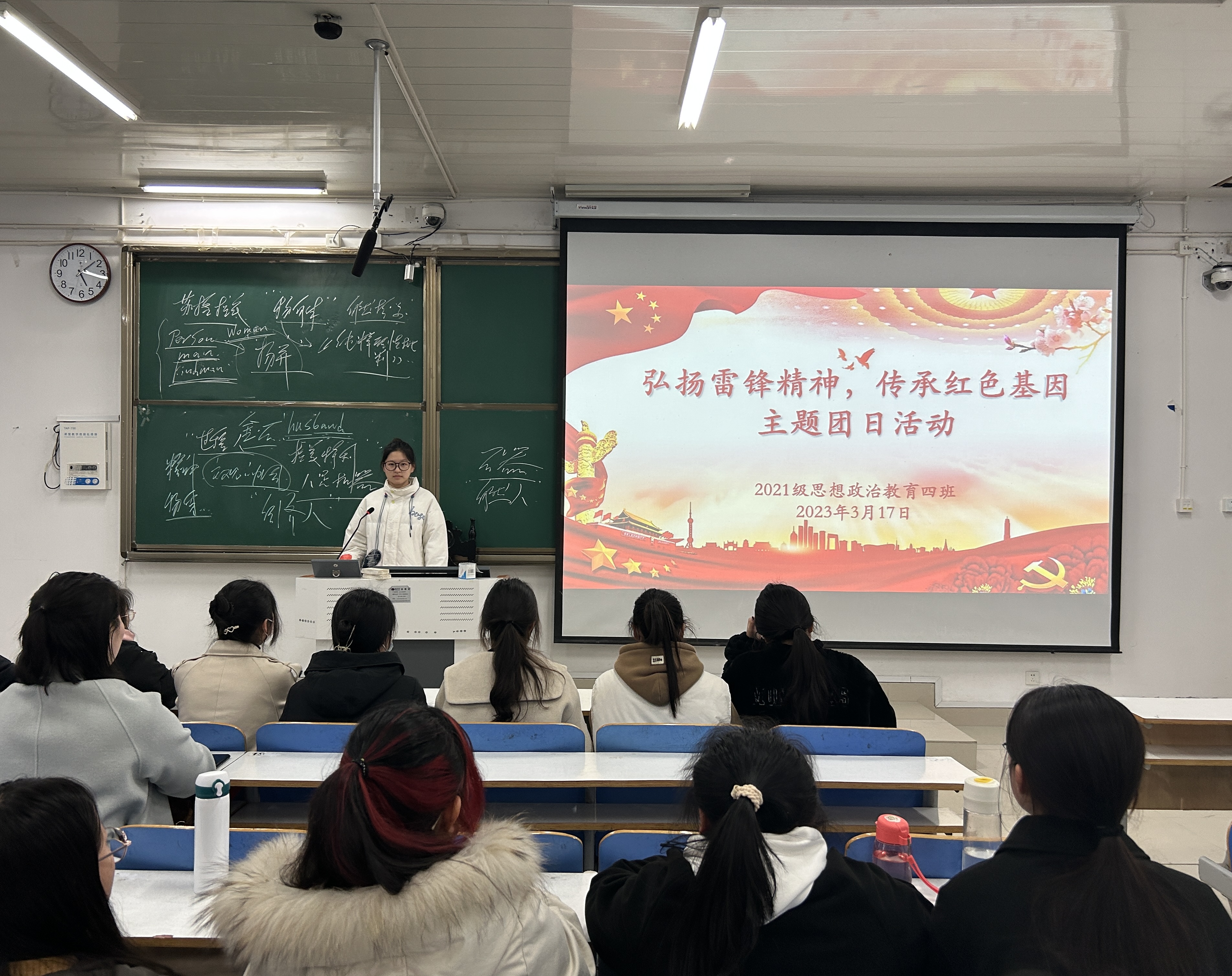 为大力弘扬雷锋精神,传承雷锋艰苦朴素的优良作风,3月17日下午,ok138cn太阳集团5292021级思想政治教育四班在社科楼514教室开展“弘扬雷锋精神,传承红色基因”主题团日活动。2021级思想政治教育四班全体成员共同参加本次活动,活动由团支书刘珂含主持。