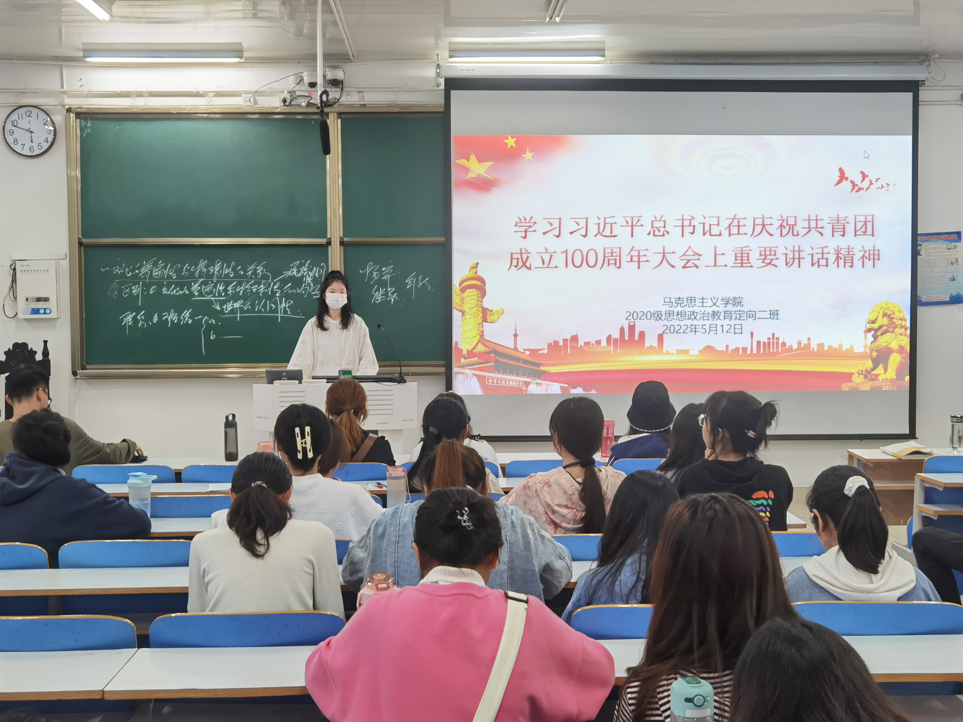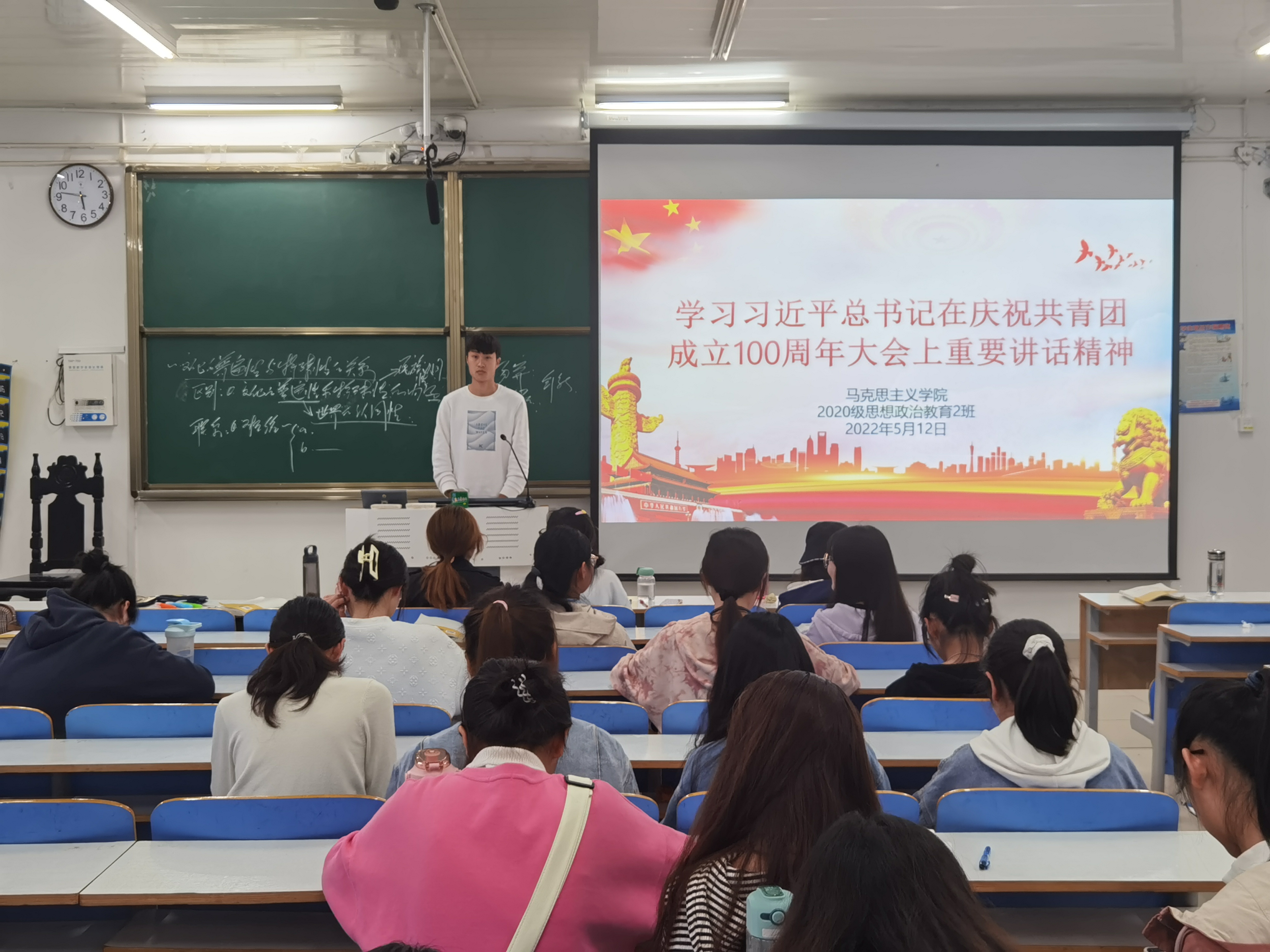 奋进新时代,百年正青春。5月12日下午,ok138cn太阳集团5292020级思想政治教育二班、定向二班在社科楼514教室开展“学习习近平总书记在庆祝中国共产主义青年团成立100周年大会上的重要讲话”主题团课。2020级思想政治教育二班、定向二班全体团员共同参与本次团课。