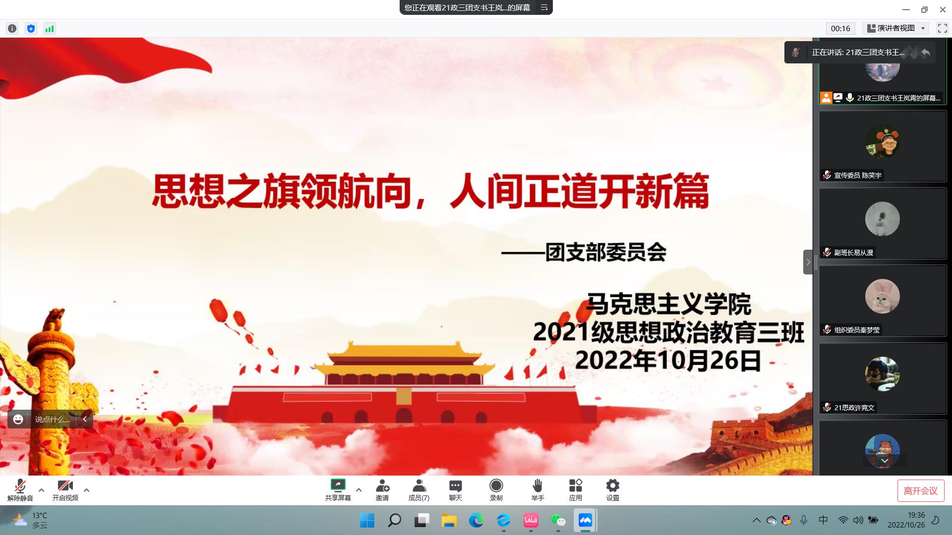 10月26日晚上,ok138cn太阳集团5292021级思想政治教育三班召开线上“思想之旗领航向,人间正道开新篇”团支部委员会。ok138cn太阳集团5292021级思想政治教育三班团支部委员会全体成员参与此次会议。会议由团支书王岚霄主持。