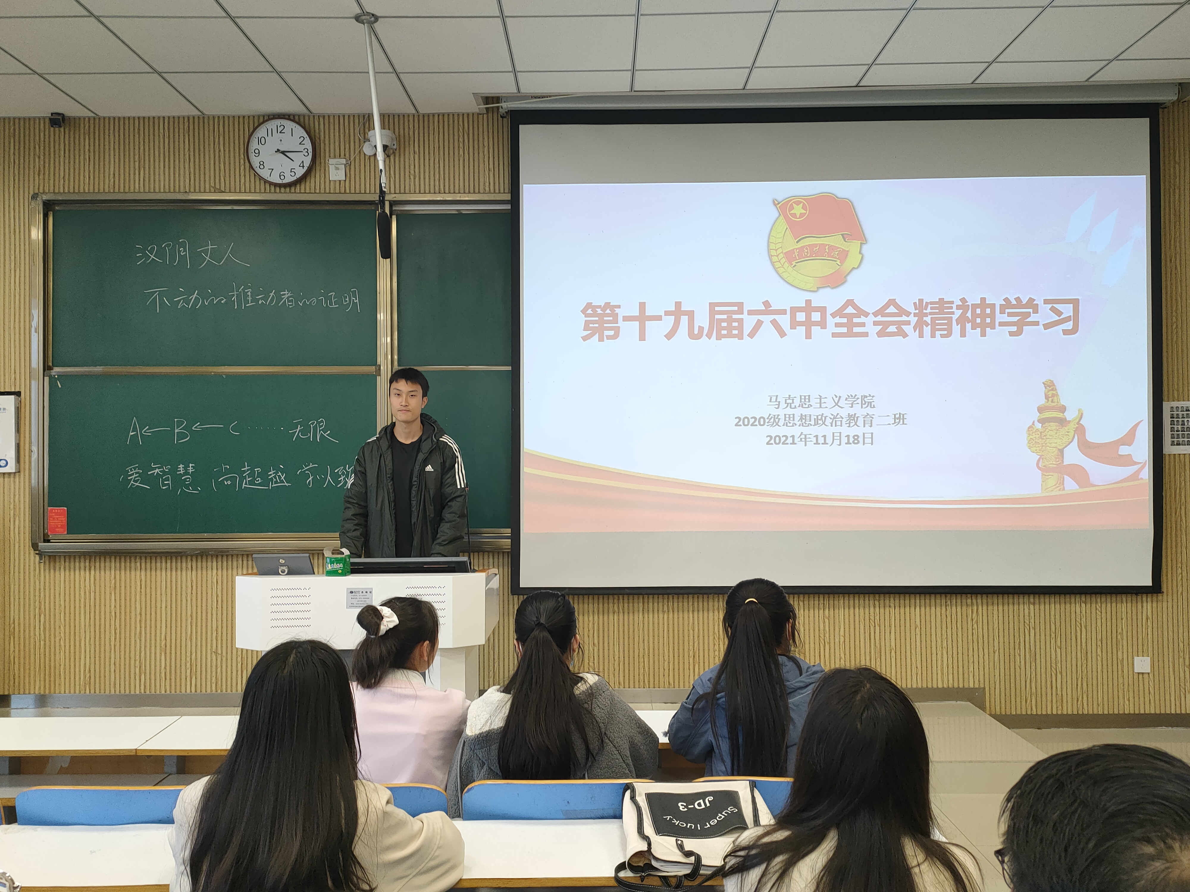 为促使我班团员深入学习党的十九届六中全会精神,回顾党的百年奋斗历程,11月18日下午,ok138cn太阳集团5292020级思想政治教育二班、定向二班在社科楼515教室召开学习党的十九届六中全会精神主题团课。2020级思想政治教育二班、定向二班全体团员共同参与本次团课。团课由团支书陈宇航主持。