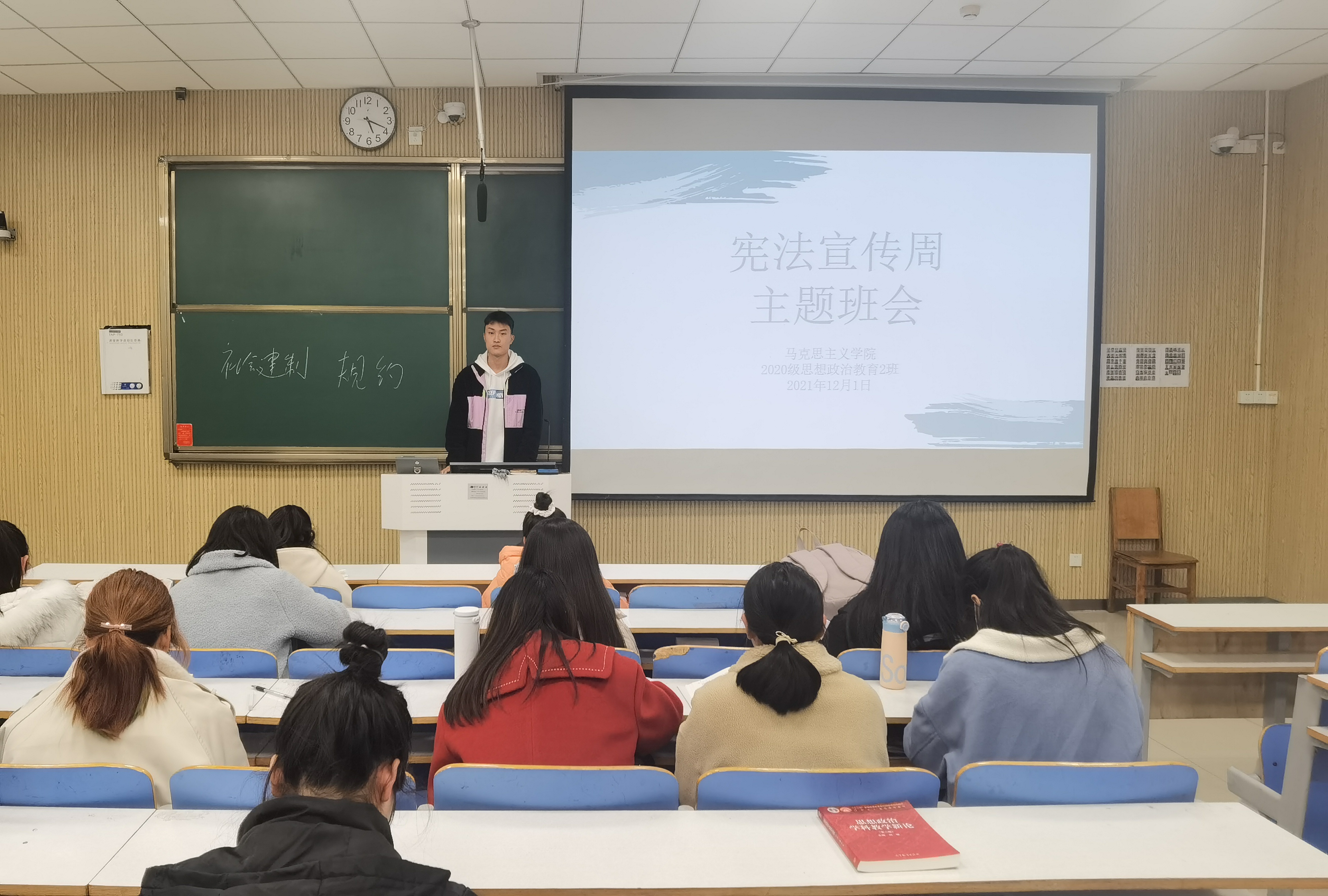 为深入落实我院关于开展“宪法宣传周”工作的具体要求,提升我班同学法治素养,12月1日下午,ok138cn太阳集团5292020级思想政治教育二班、定向二班在社科楼515教室召开“宪法宣传周”主题班会。2020级思想政治教育二班、定向二班全体同学共同参与本次班会。会议由团支书陈宇航主持。