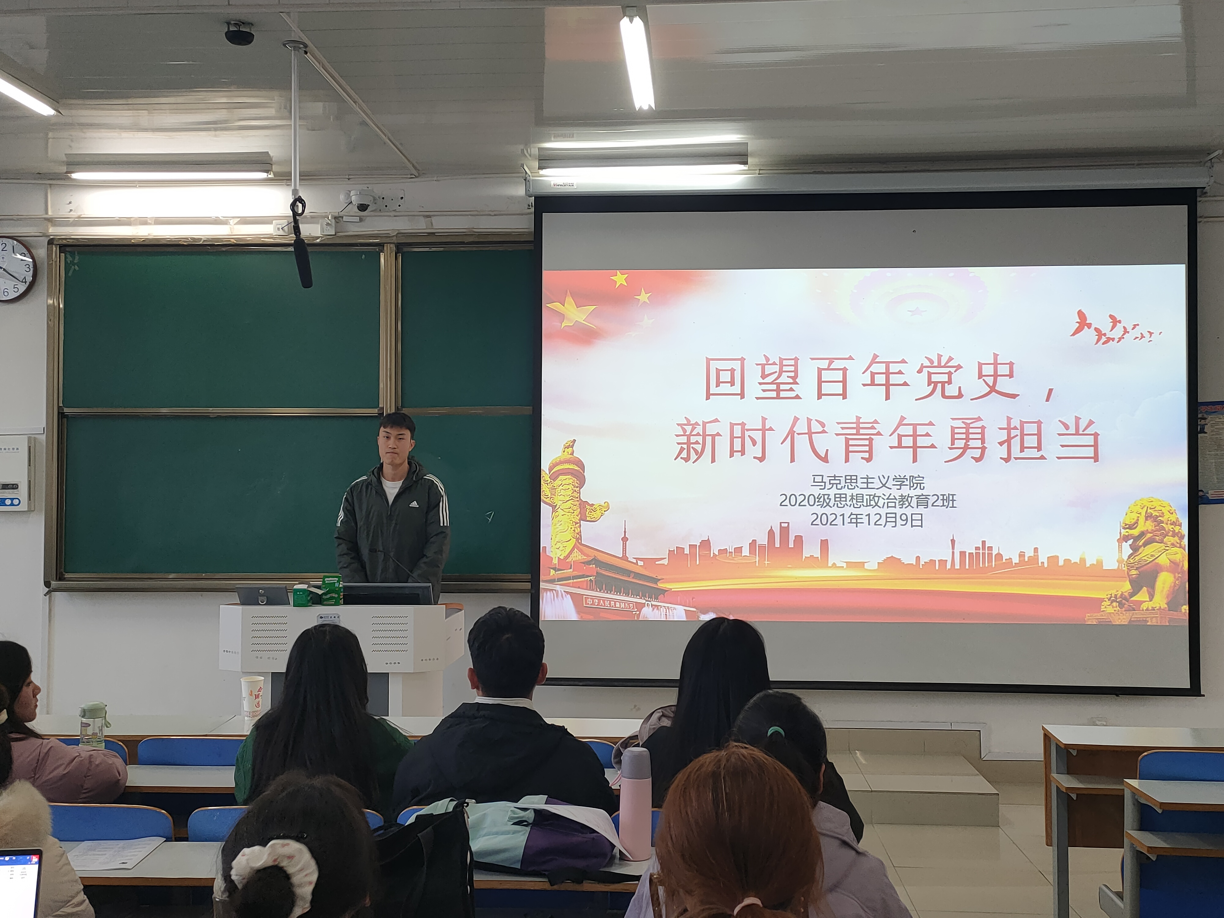 12月9日下午,ok138cn太阳集团5292020级思想政治教育二班、定向二班在社科楼514教室开展“回望百年党史,新时代青年勇担当”主题团课。2020级思想政治教育二班、定向二班全体团员共同参与本次团课。团课由团支书陈宇航讲授。
