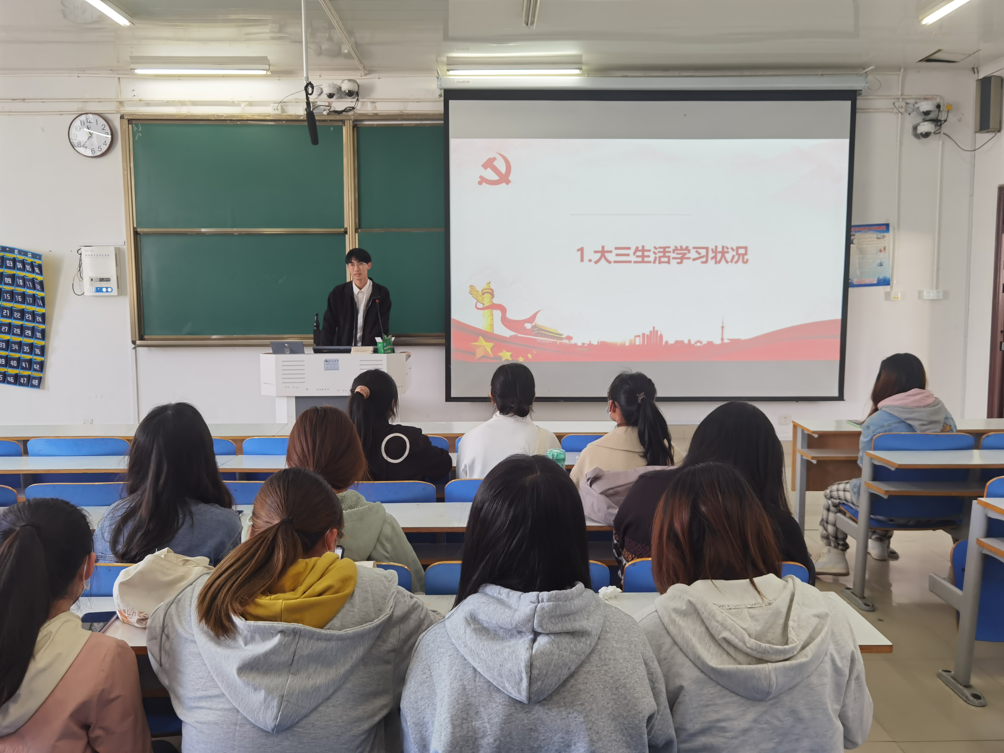 会上,王明亮、周永宁就同学们关心的大三生活学习状况、如何确定考研目标院校、考研期间的时间安排管理等问题作出解答。他们简要介绍了自己目前的学习和生活实际情况,并结合自身经验,针对同学们提出的问题提出三点建议:首先,在学习上,要明确学习方向,制定正确的学习方法,做到上课认真听讲,下课及时复习,劳逸结合,张弛有度。其次,在考研方面,要提前了解考研信息,多与参加考研的学长学姐进行沟通和交流,他们强调,每个人都有自己的学习进度和目标,切勿削足适履,要结合自身情况制定合理的复习时间,不可盲目从众。最后,基于目前国内考研形势和就业现状,他们提出,同学们应结合实际情况,提前做好就业和考研的双重准备,找准自身定位,作出最佳的考研和就业选择。