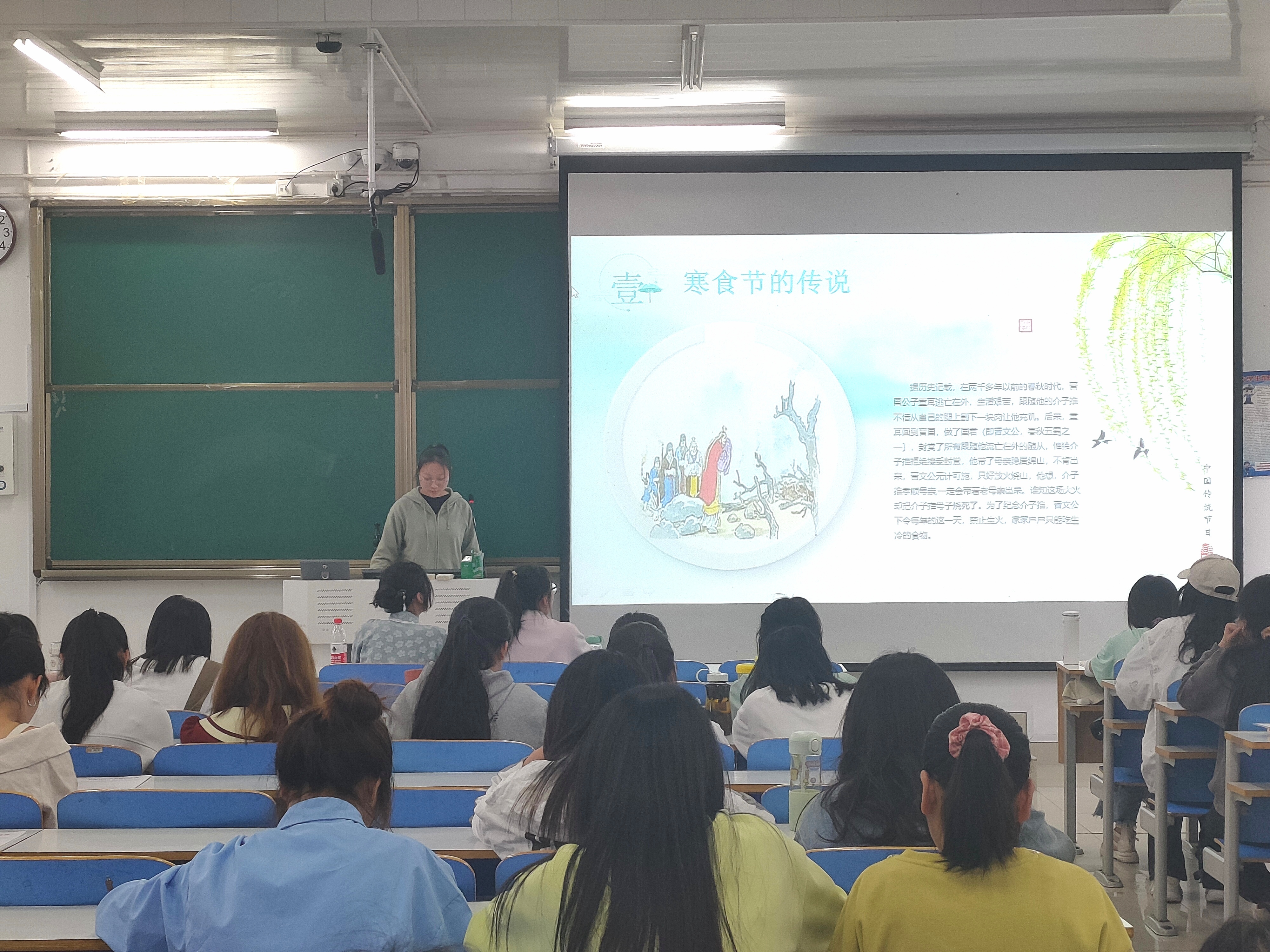 团课上,刘莹围绕“清明节的来源、习俗、特色饮食,缅怀先烈领悟革命精神”四个板块展开讲述。首先,她通过PPT课件和视频播放相结合的方式,简要介绍清明节的起源,寒食节的传说以及祭祖、扫墓缅怀先人、踏青寻春、吃枣糕、吃青团等清明节的风俗和特色饮食。随后,刘莹重点讲述了邱少云、刘胡兰、董存瑞等革命先烈的英雄故事,她表示,作为新时代青年学生,我们应当主动继承革命先辈遗志,发扬并践行爱国主义精神,用理论知识和坚定信念武装自己,为实现中华民族的伟大复兴而奋勇拼搏。