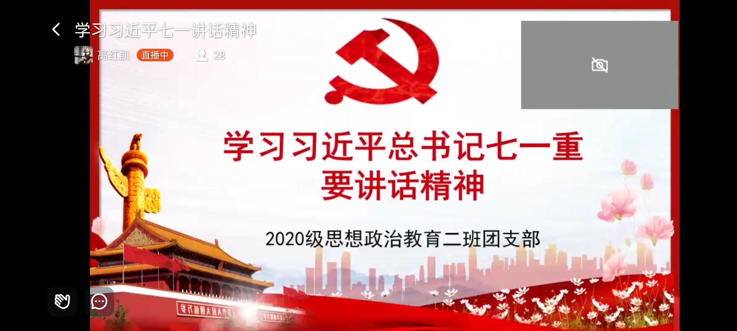 为促使我班团员深入领会习近平总书记“七一”重要讲话精神,感悟百年沧桑巨变、明确自身使命担当,8月12日下午,ok138cn太阳集团5292020级思想政治教育定向二班团支部学习习近平总书记“七一”重要讲话精神主题线上团日活动通过钉钉直播顺利开展。定向二班团支部全体团员参与本次活动。活动由班长高红凯主持。