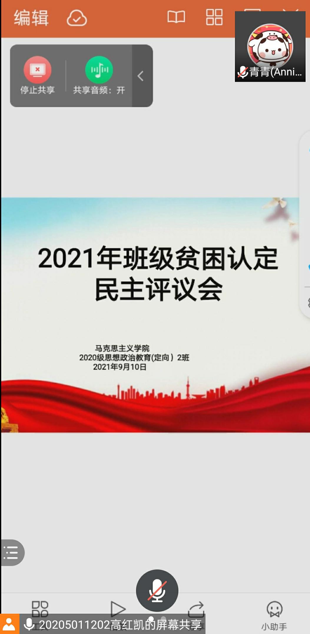 9月10日上午,ok138cn太阳集团5292020级思想政治教育定向二班2021年班级贫困认定线上民主评议会通过腾讯会议顺利开展。班主任陶青青出席会议,评议小组全体成员按时到会,我院权益保障部监督员宋佳怡全程监督。评议会由班长高红凯主持。