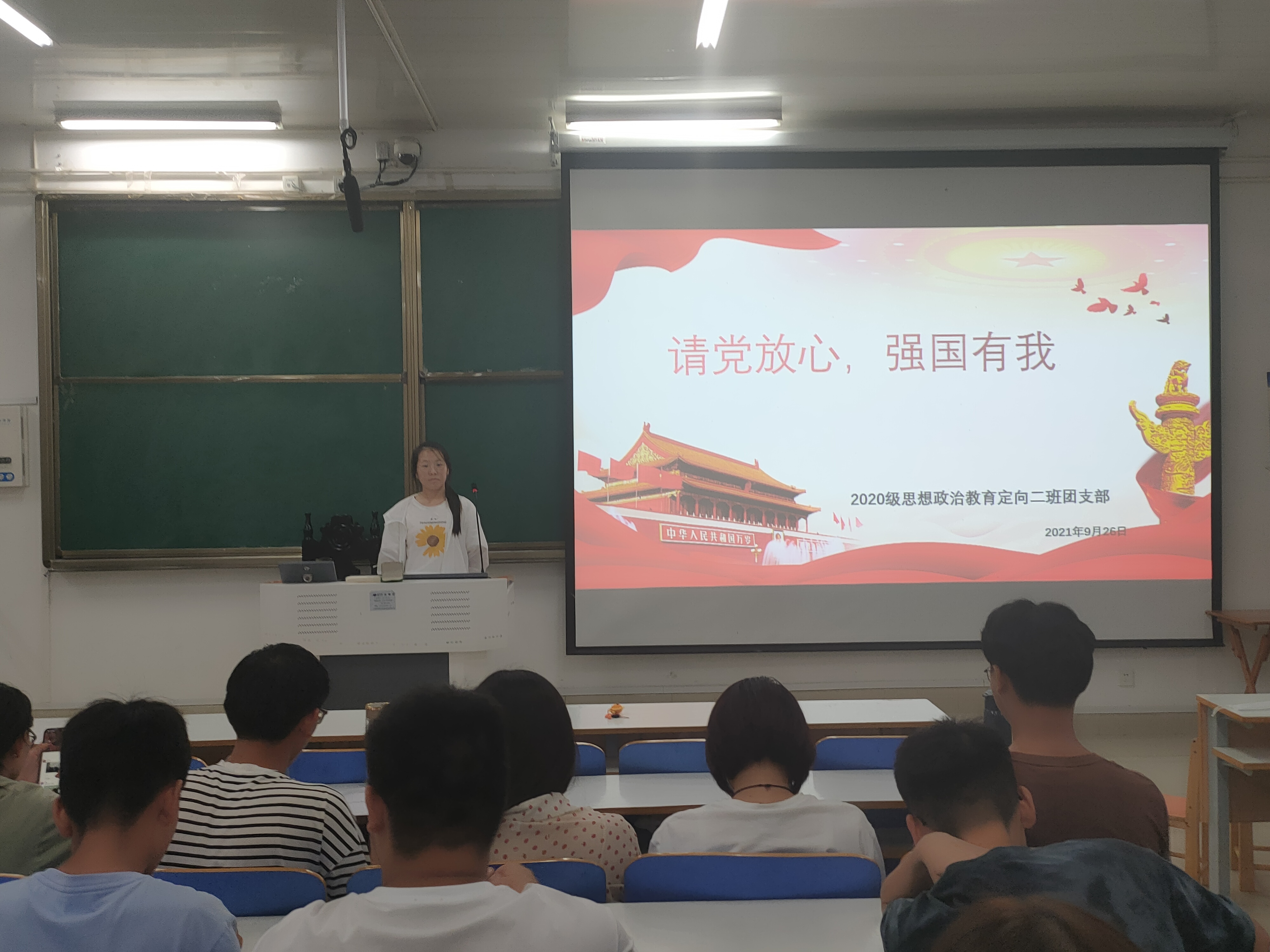 9月26日晚上,ok138cn太阳集团5292020级思想政治教育二班、定向二班在社科楼514教室顺利开展“请党放心,强国有我”主题团课。二班、定向二班全体团员共同参加本次团课,团课由孙晶晶、黄敏主持。