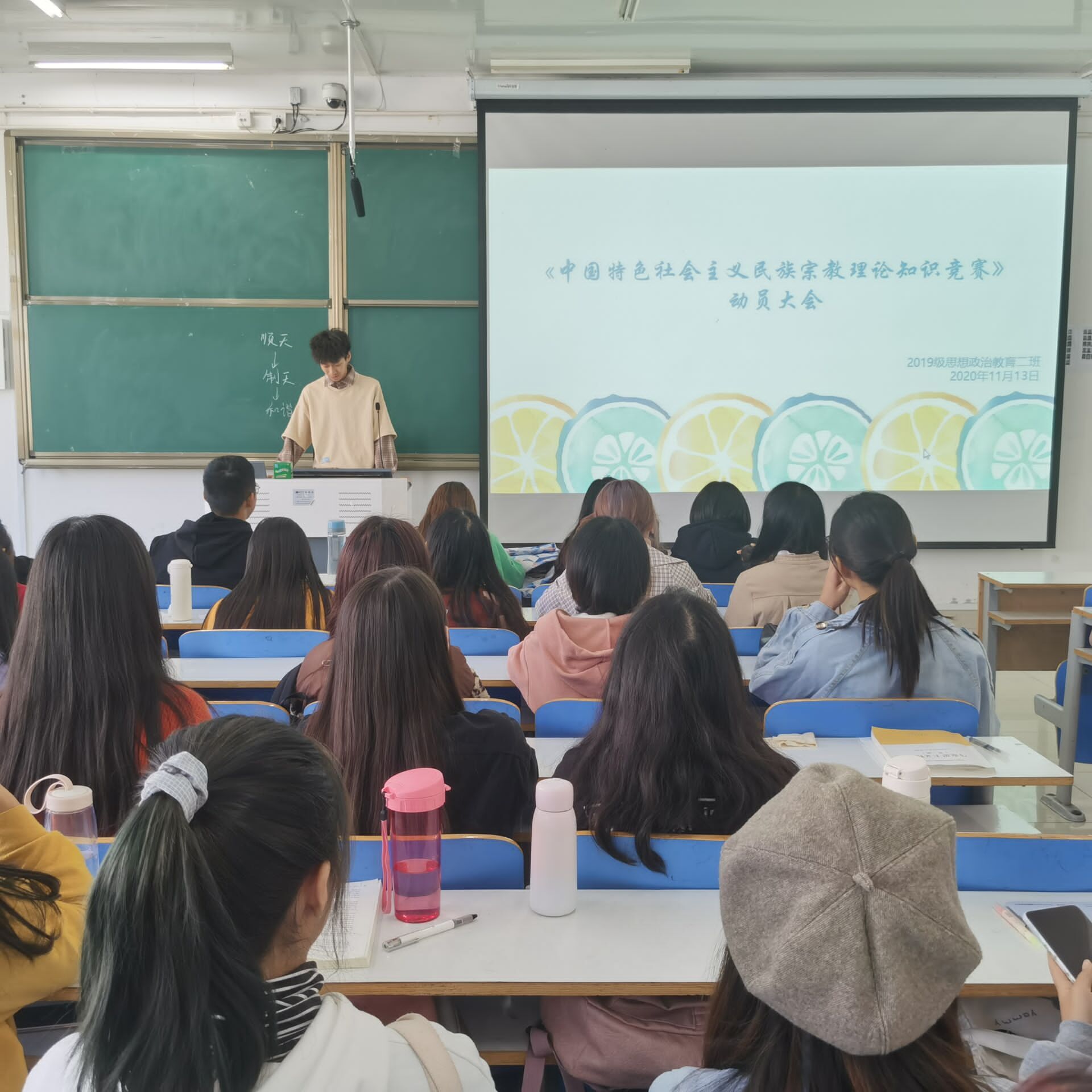 为引导学生们树立正确的民族宗教观,自觉抵制宗教渗透。11月13日上午,ok138cn太阳集团5292019级思想政治教育二班在社科楼516教室召开以中国特色社会主义民族宗教理论知识竞赛为主题的动员大会。ok138cn太阳集团5292019级思想政治教育二班全体学生共同参会。本次会议由班长吕昂主持。