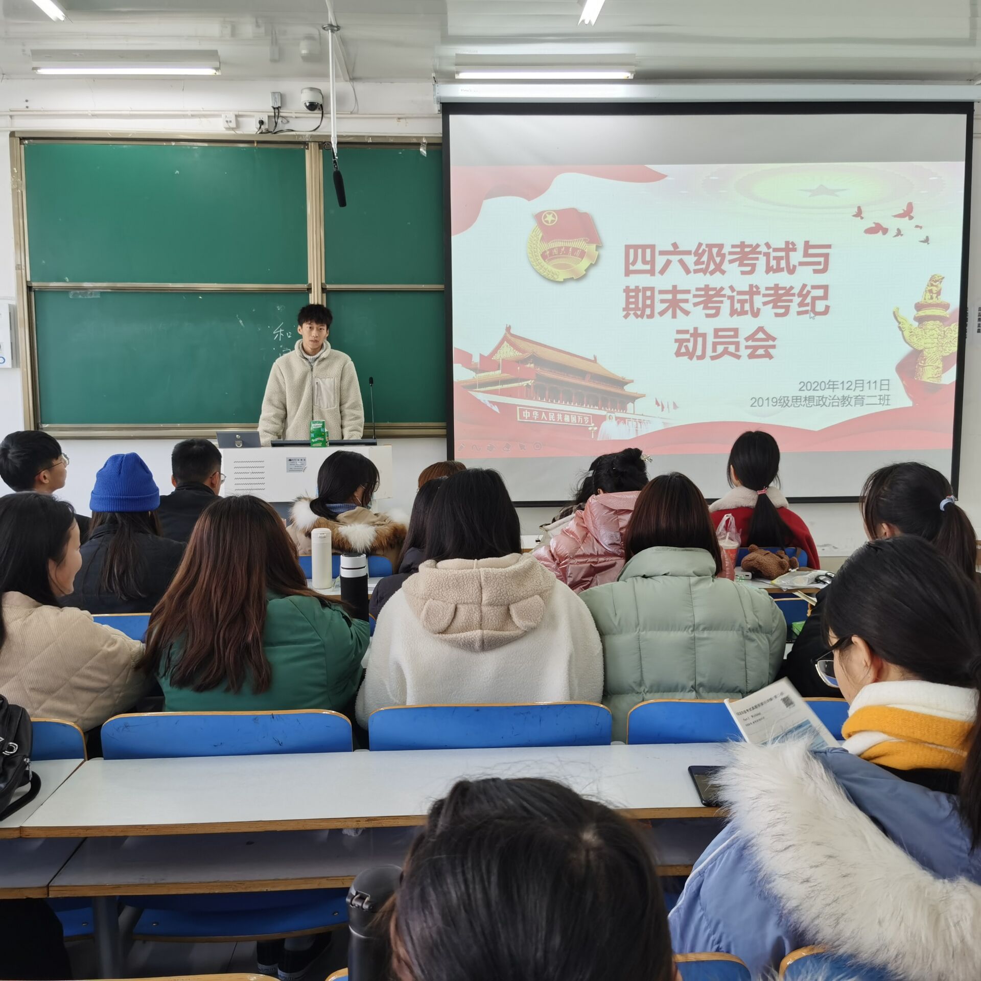 为帮助同学们更好地应对英语四级考试与期末考试,严肃考场纪律。12月11日下午,ok138cn太阳集团5292019级思想政治教育二班在社科楼514教室召开了大学生英语四级考试与期末考试动员大会。辅导员陶青青和ok138cn太阳集团5292019级思想政治教育二班全体成员共同参会。本次会议由副班长吕昂主持。