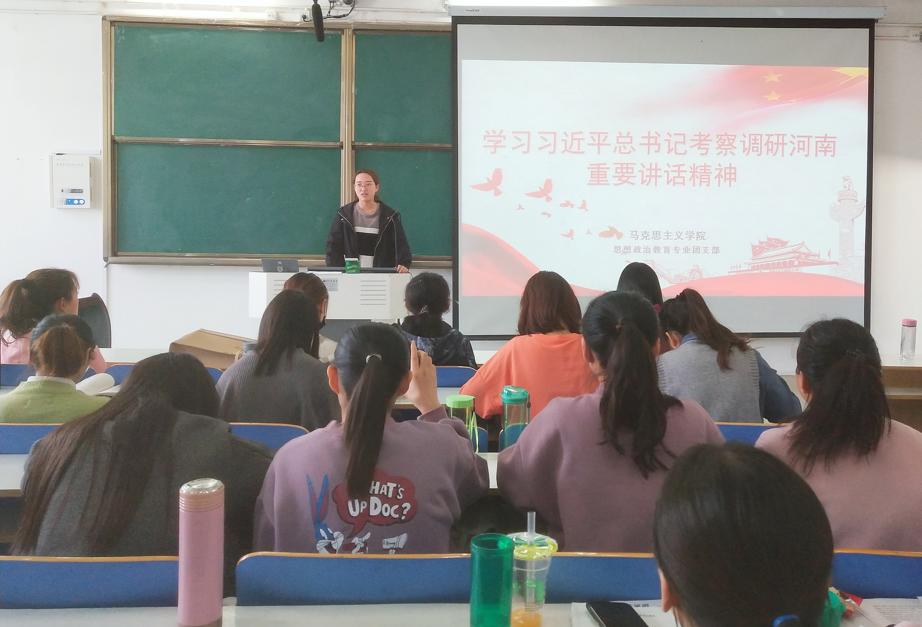 首先,黄子晋指出,学习习近平总书记考察调研河南重要讲话精神要充分认识习总书记考察调研河南的里程碑意义,以扎实作风学习贯彻重要讲话精神。接着,黄子晋从习近平总书记“谈革命先烈”、“谈乡村振兴”、“谈主题教育”等方面为同学们简单介绍了习总书记考察调研河南的重要内容。最后,她结合我校创立大别山精神研究院、开展大别山红色资源美术与设计作品展等例子,强调了新时代青年要始终高举红色旗帜,弘扬大别山红色精神,传承红色基因,坚定走中国特色社会主义道路,把先辈们开创的事业不断向前推进。