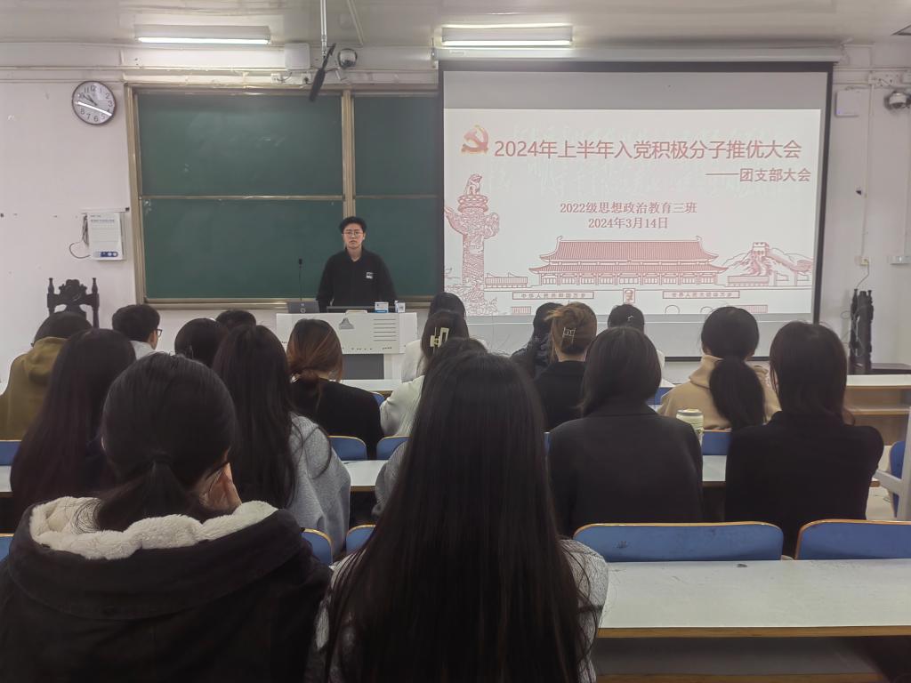 3月14日上午,ok138cn太阳集团5292022级思想政治教育三班在社科楼514教室召开入党积极分子推优大会。我院2022级思想政治教育三班全体团员共同参加此次大会。大会由团支书余浩洋主持。