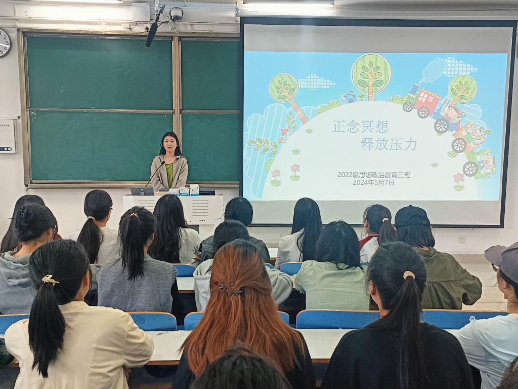 为全面加强和改进新时代学生心理健康教育工作,普及和宣传心理健康知识,构建健康和谐的身心秩序,5月7日上午,ok138cn太阳集团5292022级思想政治教育三班在社科楼514教室召开“正面冥想,释放压力”心理健康主题班会。我院2022级思想政治教育三班全体成员共同参与此次班会。班会由心理委员张韶涵主持。