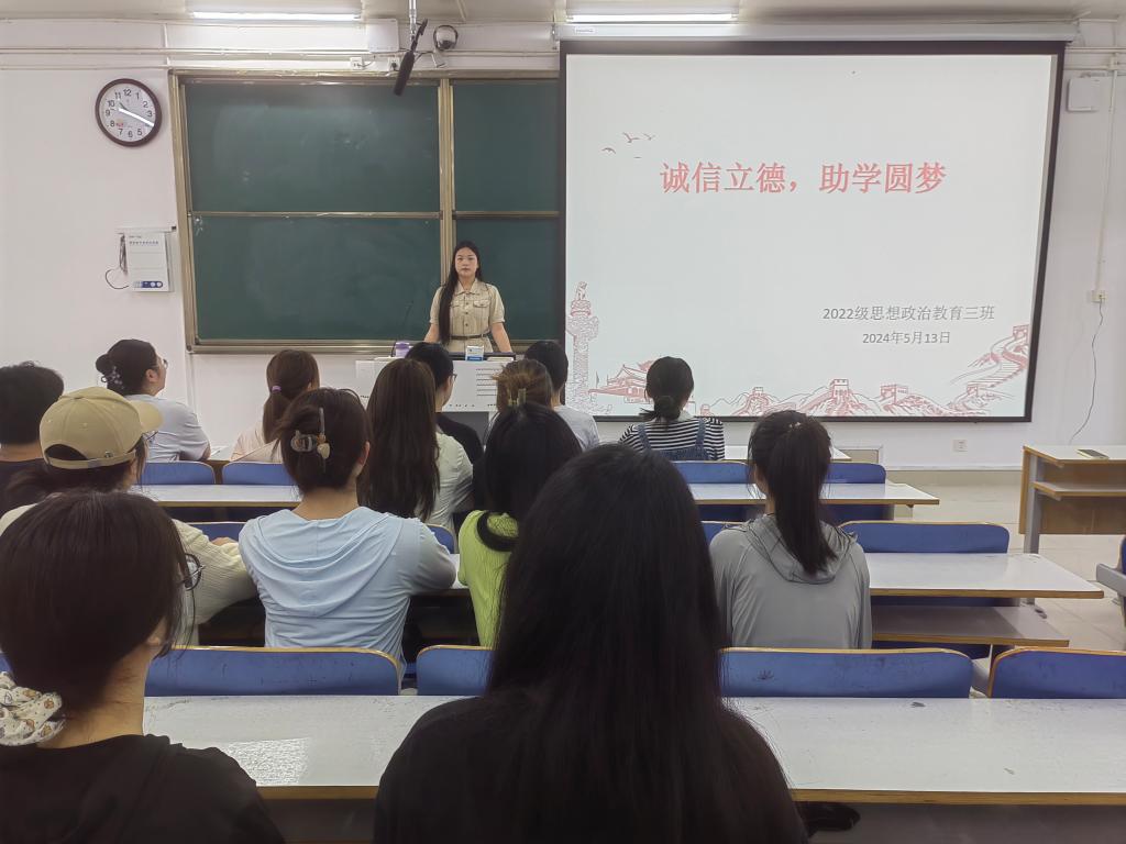 为落实立德树人根本任务,增强广大青年学生的诚信意识和责任意识,加大资助育人力度,5月13日上午,ok138cn太阳集团5292022级思想政治教育三班在社科楼514教室召开“诚信立德,助学圆梦”主题班会。我院2022级思想政治教育三班全体成员共同参与此次班会。班会由副班长雷露露主持。