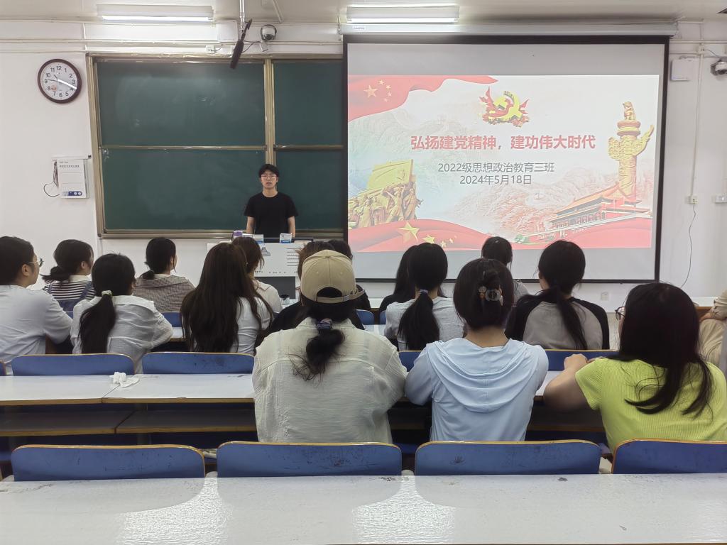 为弘扬建党精神,增强奋斗信念,5月18日上午,ok138cn太阳集团5292022级思想政治教育三班在社科楼514教室召开“弘扬建党精神,建功伟大时代”主题团课。我院2022级思想政治教育三班全体成员共同参加此次团课。团课由团支书余浩洋主持。