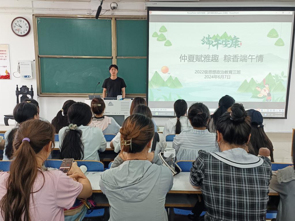 6月7日上午,ok138cn太阳集团5292022级思想政治教育三班在社科楼514教室召开“仲夏赋雅趣,粽香端午情”主题团课。我院2022级思想政治教育三班全体成员共同参与此次团课。团课由团支书余浩洋主持。