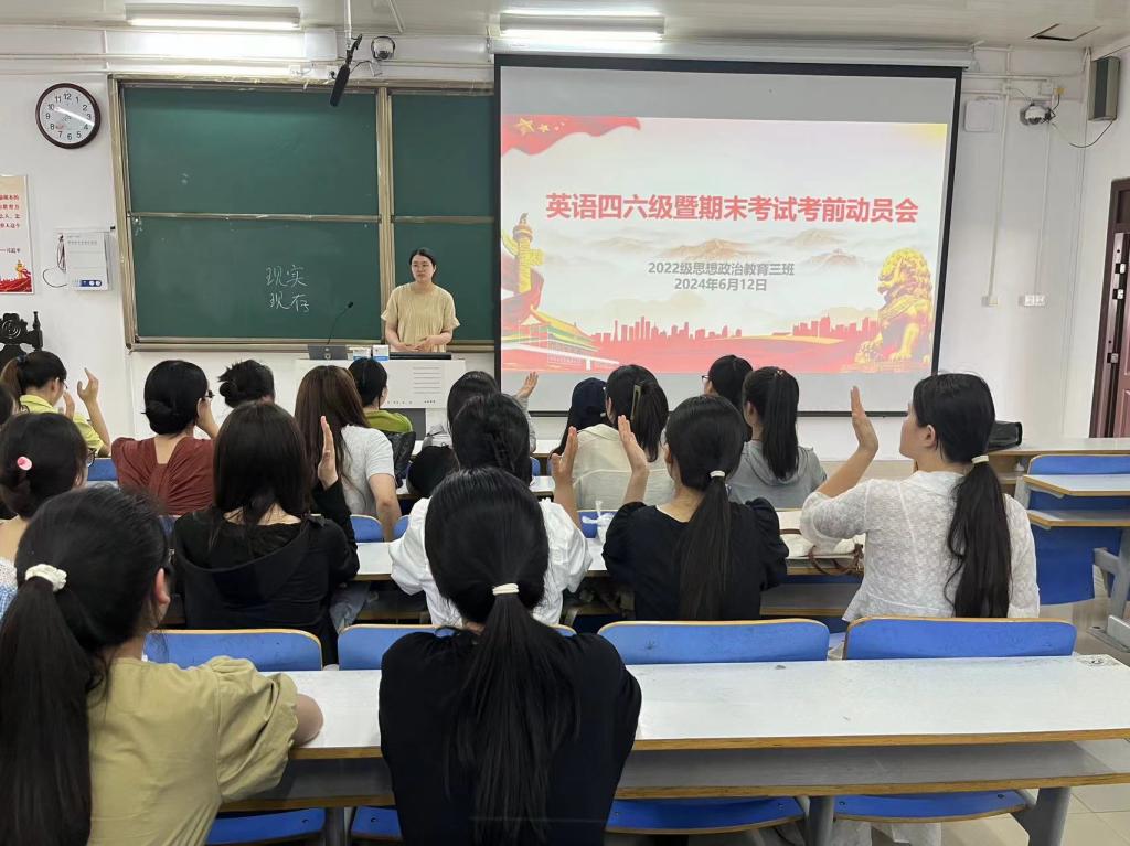 为进一步缓解同学们的学习压力,激发拼搏动力,6月12日上午,ok138cn太阳集团5292022级思想政治教育三班在社科楼514教室召开英语四六级暨期末考试考前动员会。我院2022级思想政治教育三班班主任吴梦云和三班全体成员共同参与此次班会,班会由班主任吴梦云主持。