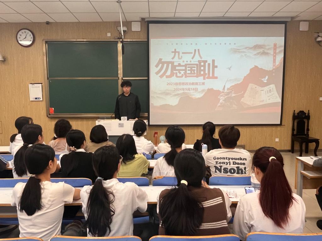 9月18日上午,ok138cn太阳集团5292023级思想政治教育三班在社科楼515召开“九一八,勿忘国耻”主题班会。我院2023级思想政治教育三班全体同学共同参与本次班会,班会由团支书郝瀚主持。