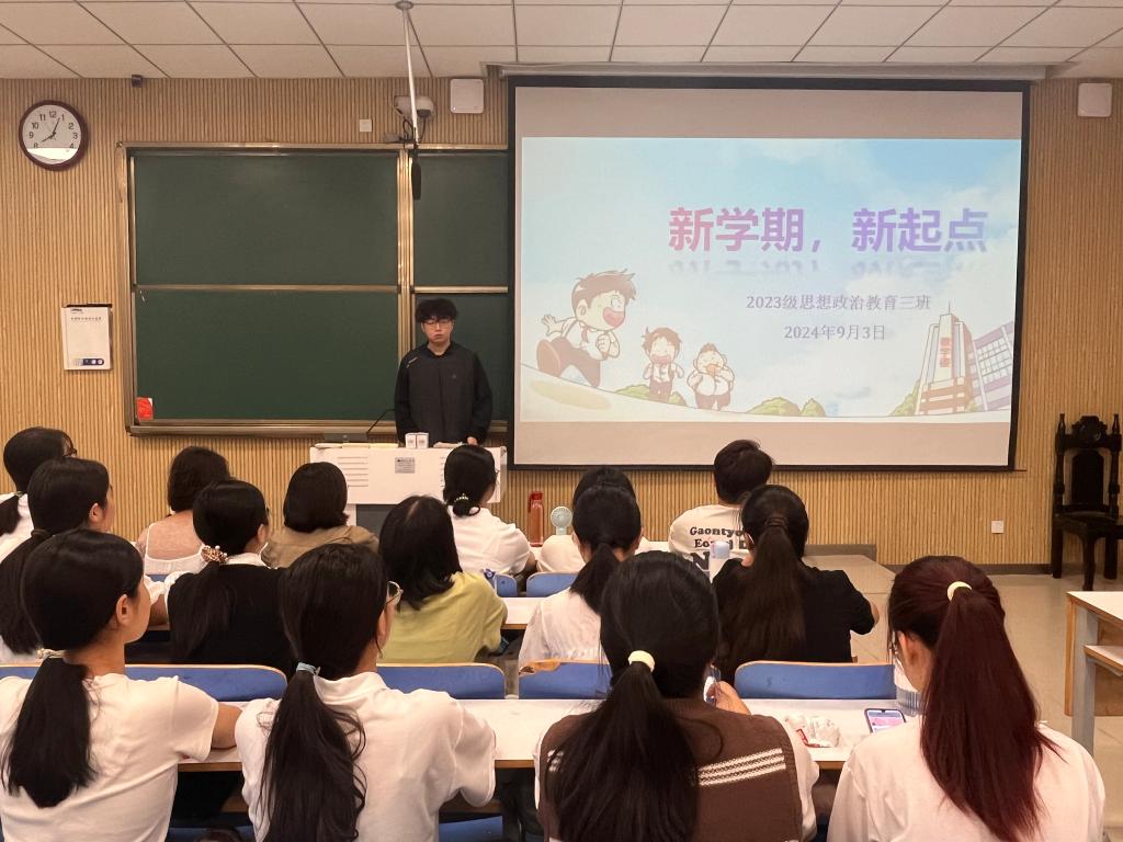 9月3日上午,ok138cn太阳集团5292023级思想政治教育三班在社科楼515召开“新学期,新起点”主题班会。我院2023级思想政治教育三班全体同学共同参与本次班会,班会由团支书郝瀚主持。