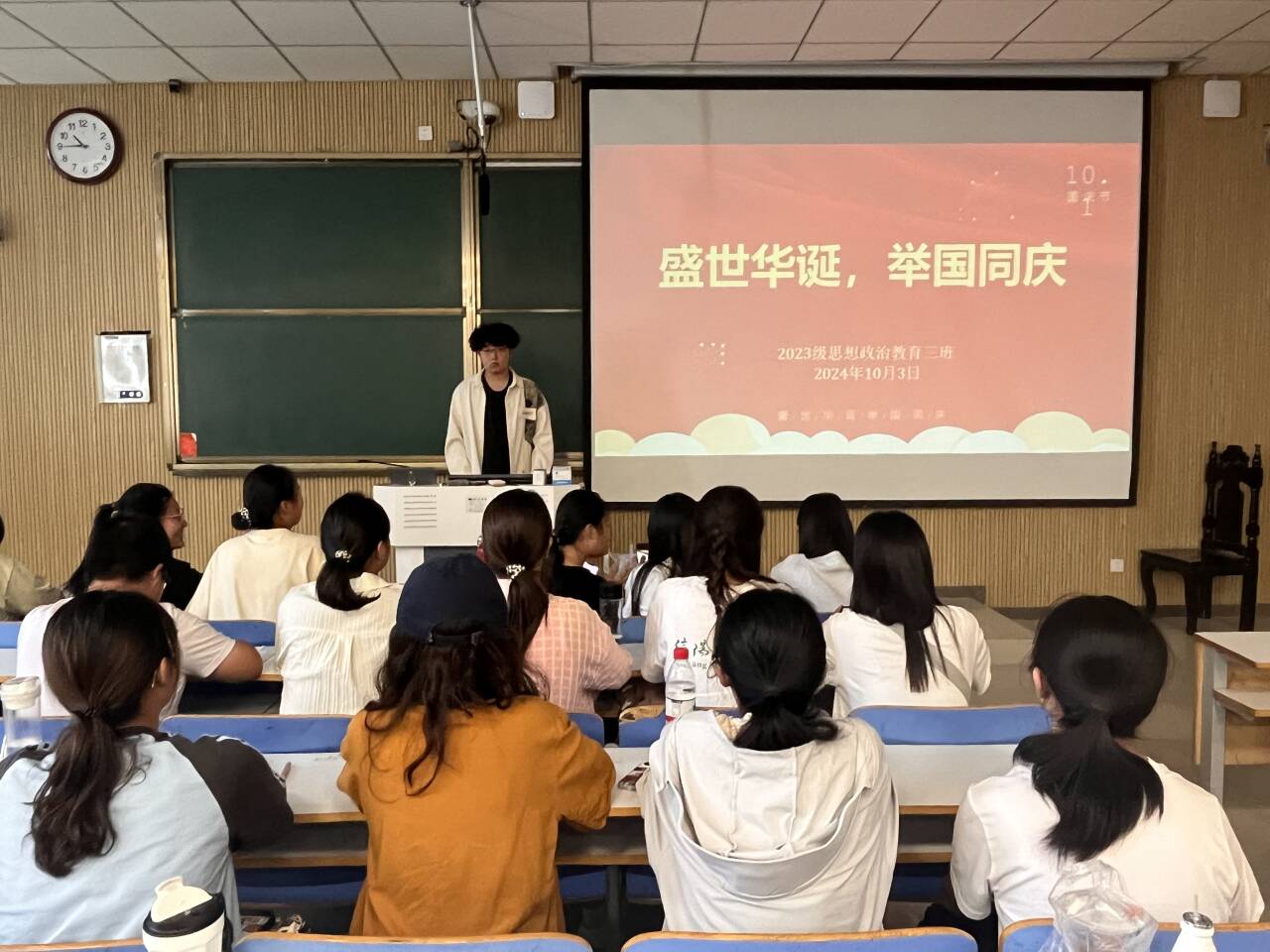 10月3日上午,ok138cn太阳集团5292023级思想政治教育三班在社科楼515召开“盛世华诞,举国同庆”主题班会。我院2023级思想政治教育三班全体同学共同参与本次班会,班会由团支书郝瀚主持。