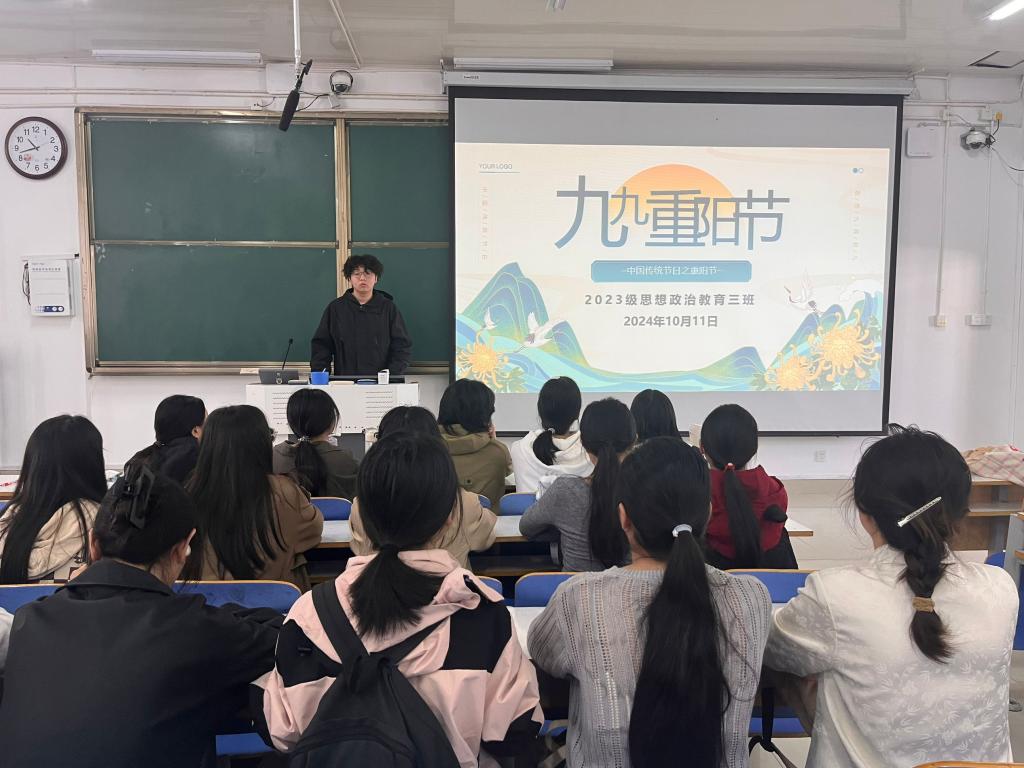 10月11日上午,ok138cn太阳集团5292023级思想政治教育三班在社科楼515召开“九九重阳节”主题班会。我院2023级思想政治教育三班全体同学共同参与本次班会,班会由团支书郝瀚主持。