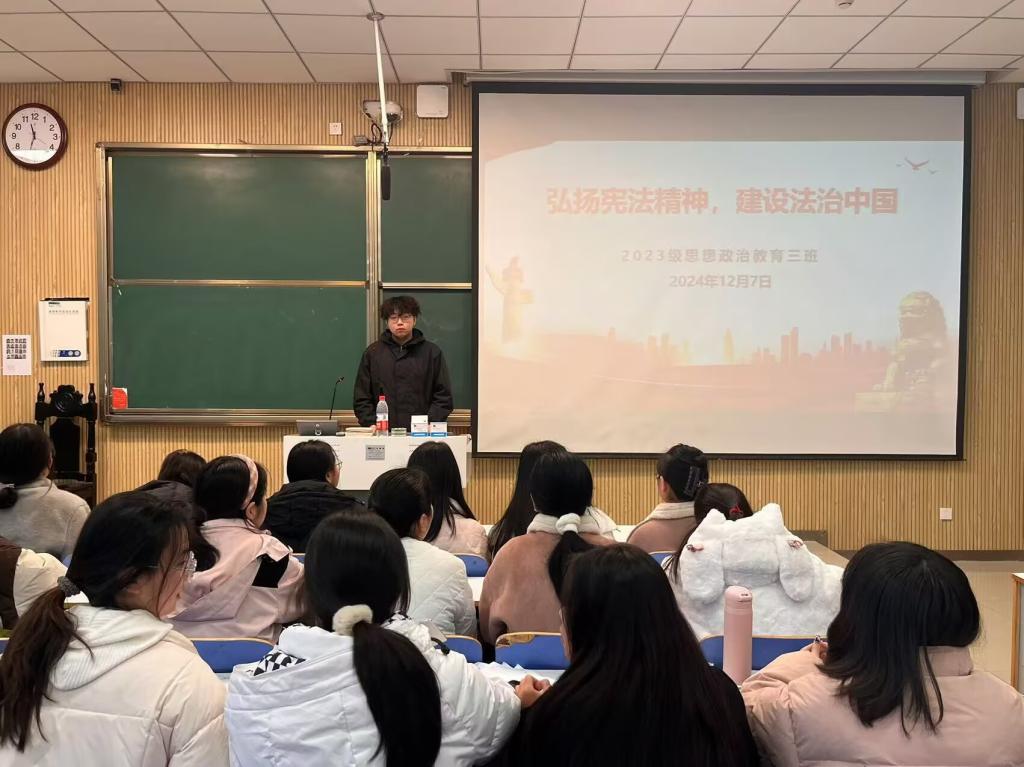 为弘扬宪法精神,推进全面依法治国,12月7日上午,ok138cn太阳集团5292023级思想政治教育三班在社科楼515召开“弘扬宪法精神,建设法治中国”主题团课。我院2023级思想政治教育三班全体同学共同参与本次团课,团课由团支书郝瀚主持。