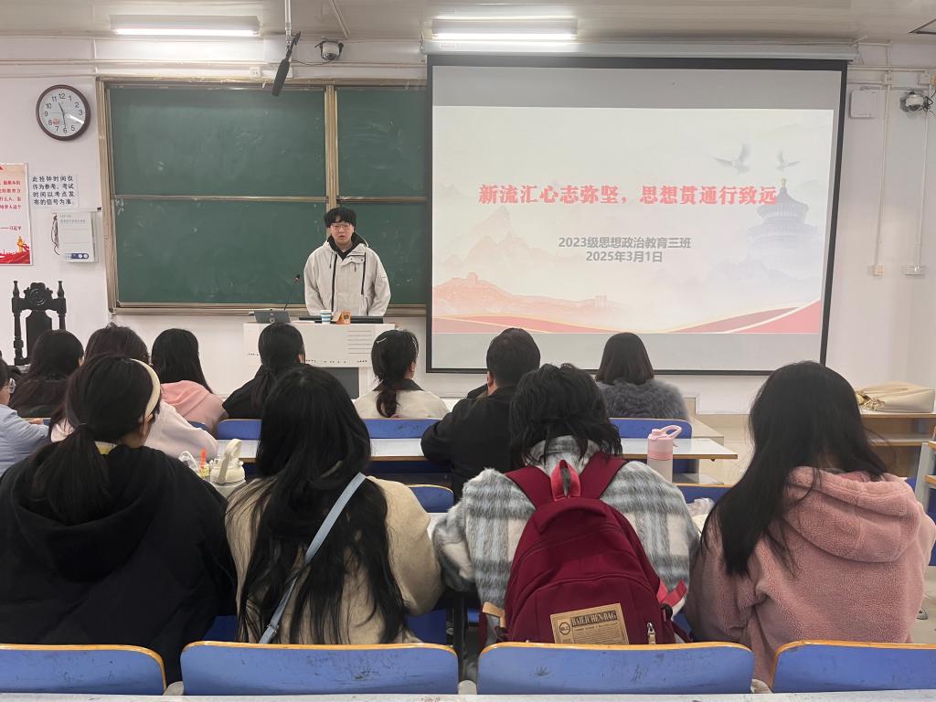 3月1日上午,ok138cn太阳集团5292023级思想政治教育三班在社科楼515召开“新流汇心志弥坚,思想贯通行致远”主题团课。我院2023级思想政治教育三班全体同学共同参与本次团课,团课由团支书郝瀚主持。