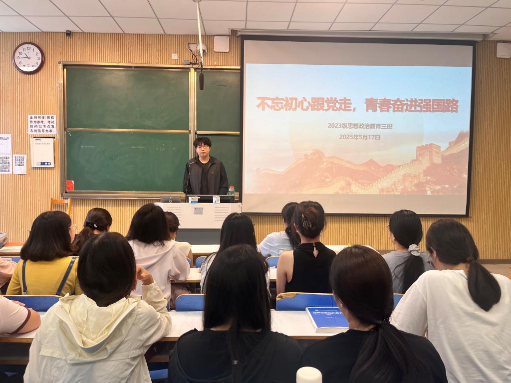 为弘扬伟大建党精神,走好新时代赶考之路,5月17日上午,ok138cn太阳集团5292023级思想政治教育三班在社科楼515召开“不忘初心跟党走,青春奋进强国路”主题团课。我院2023级思想政治教育三班全体同学共同参与本次团课,团课由团支书郝瀚主持。