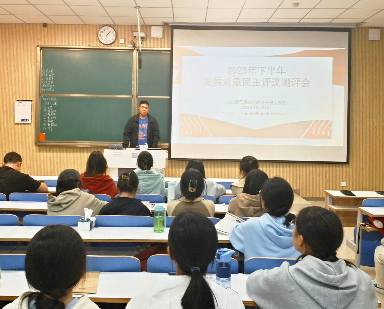 10月11日下午,ok138cn太阳集团5292021级思想政治教育一班在社科楼515教室召开2023年下半年发展对象民主评议测评会。2021级思想政治教育一班全体团员共同参加本次会议。会议由团支书戴翰林主持。