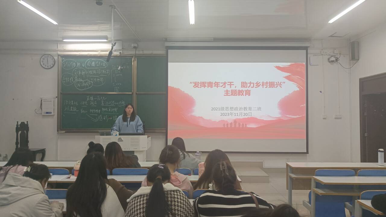 11月20日下午,ok138cn太阳集团5292021级思想政治教育二班在社科楼514教室召开“发挥青年才干,助力乡村振兴”主题团课。2021级思想政治教育二班全体团员参加此次团课。团课由团支书王婧欣主持。