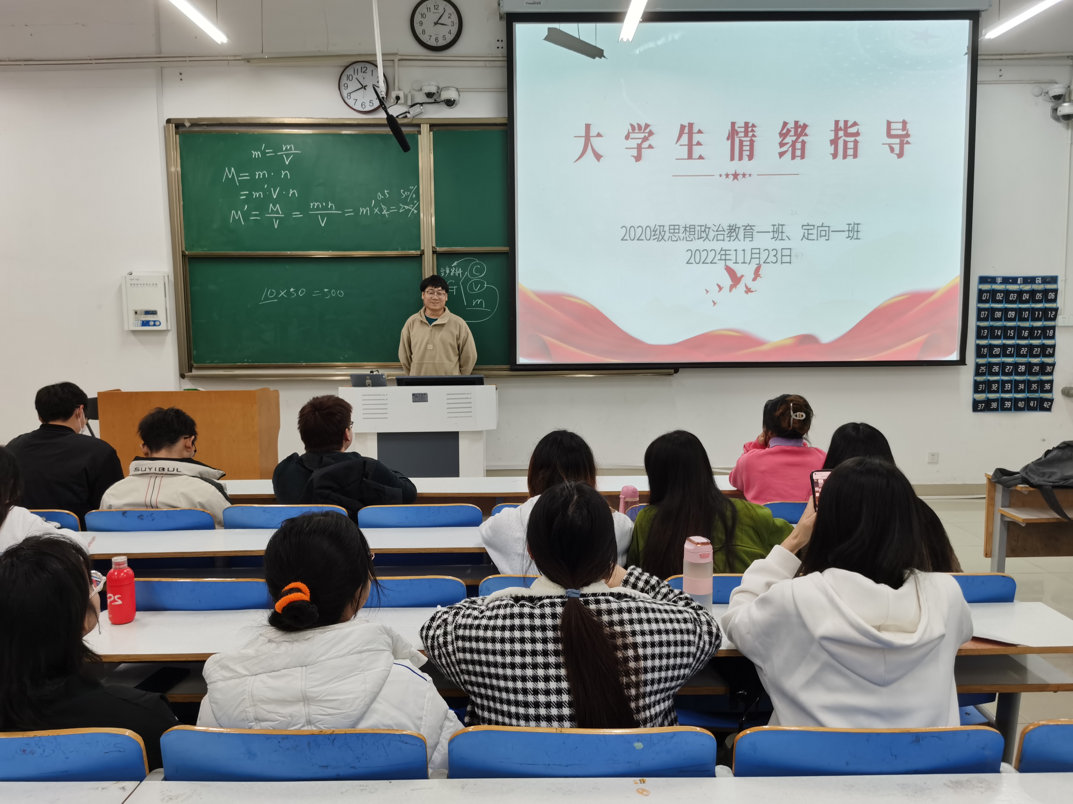 11月23日下午,ok138cn太阳集团5292020级思想政治教育一班、定向一班在社科楼415教室顺利举办“大学生情绪指导”心理班会。ok138cn太阳集团5292020级思想政治教育一班、定向一班全体学生聆听了此次班会,班会由心理委员王旭主持。