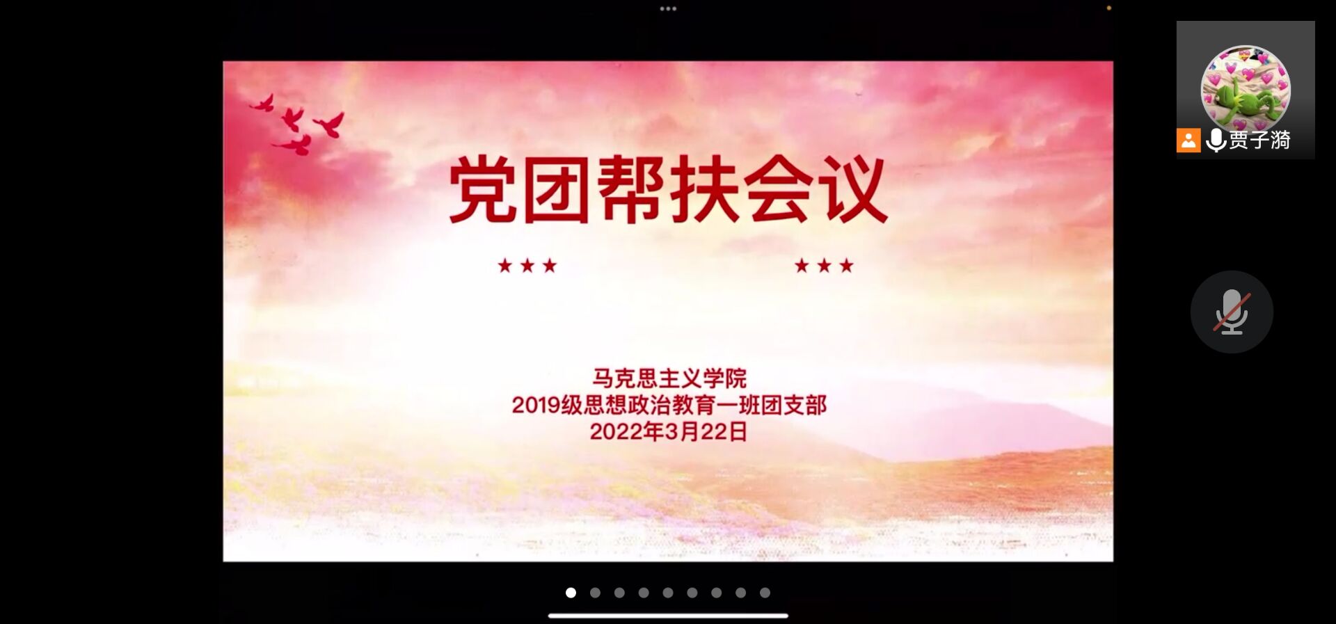 3月22日下午,ok138cn太阳集团5292019级思想政治教育一班第一团支部在腾讯会议召开“党团携手·党团帮扶会”。ok138cn太阳集团5292019级思想政治教育一班群体成员参加本次会议,会议由支书贾子漪主持。