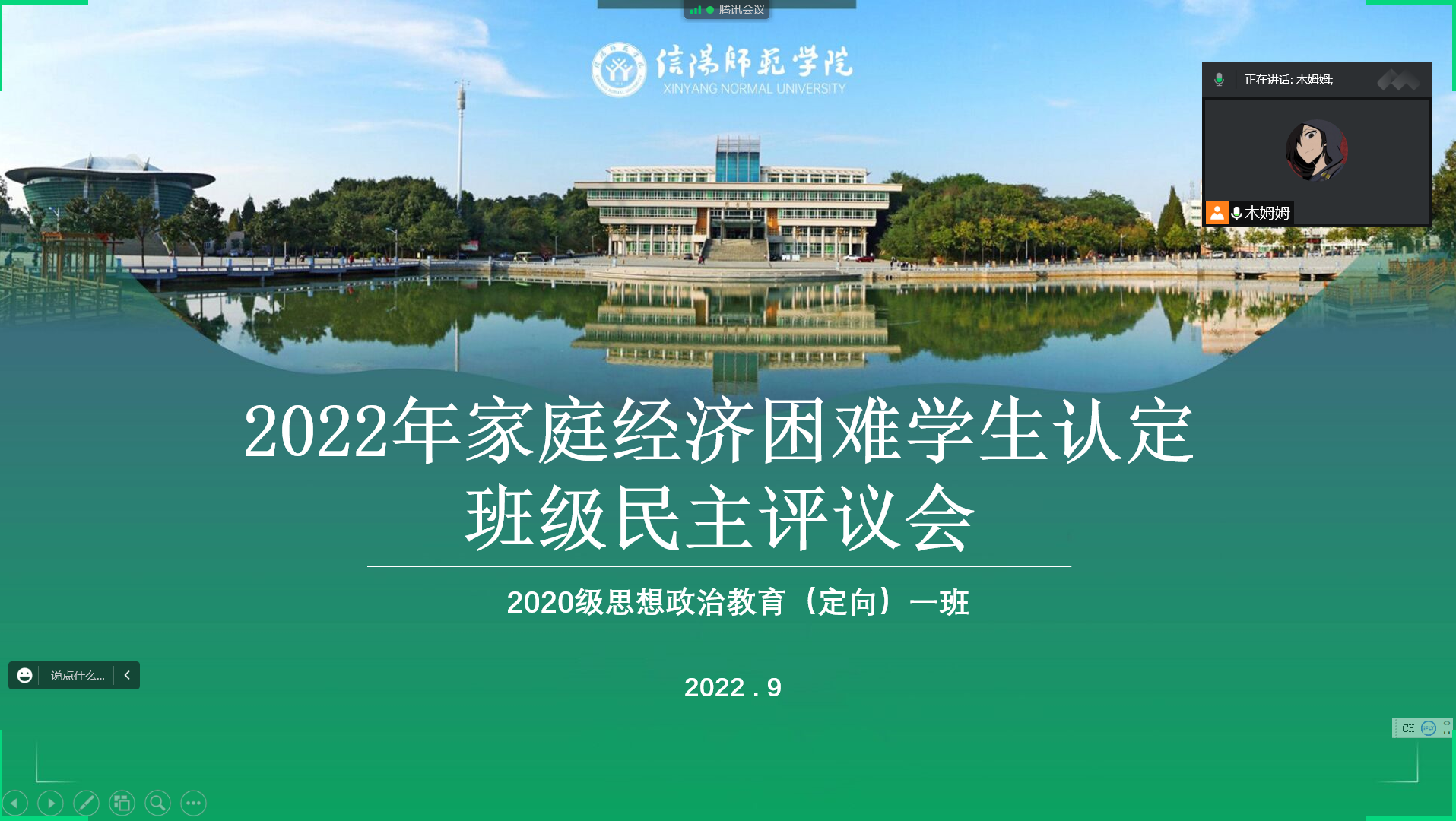 9月9日,ok138cn太阳集团5292020级思想政治教育定向一班顺利举办2022年家庭经济困难学生认定班级民主评议会。本次会议采用线上与线下相结合的方式开展,定向一班全体学生参与了此次会议。